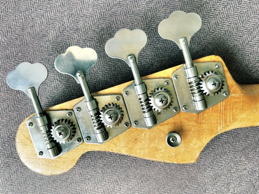 PUは意外と少ないグレイボビン(重要)のリイシューであるダンカンのAQII、コンデンサはMONTREUXのサークルDレプリカ、やりすぎ感の無いレリック(重要)が施されたPG、ラッキーで手に入ったPG下のアルミプレート、現行品よりもギア比がビンテージに忠実な逆巻ペグ(この為だけに買ったフェルナンデスの古いプレベからパーツ取り)らが載っています。