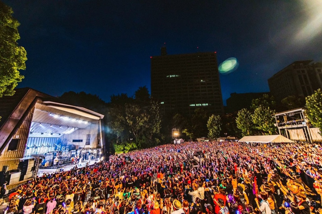 来月クローズが予定されている日比谷野外大音楽堂を舞台にしたこのGIGでは、一曲目の「夜明け」から23年前を彷彿とさせる、客席と一体となった熱気と綾小路 翔のMC、熱中症対策として実施された給水タイム、そして日没タイミングでの「落陽」など心憎い演出を含めた全20曲が熱く歌い上げられた。