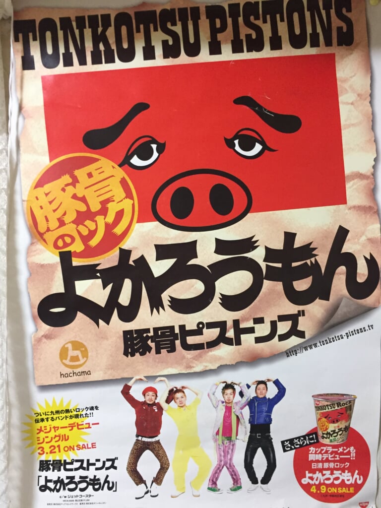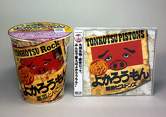 Tプロデューサー:豚骨ピストンズというバンド名でデビュー曲が「よかろうもん」となれば、ラーメンしか想像できなかったから、日清食品と話をしたら担当者が面白がって「じゃあ同じタイトルでラーメン作っちゃおう」って。カップ麺とジャケットのデザインを同じにして同時発売したの。九州限定だったんだけど、ポスターはラーメンとCD半分ずつで。