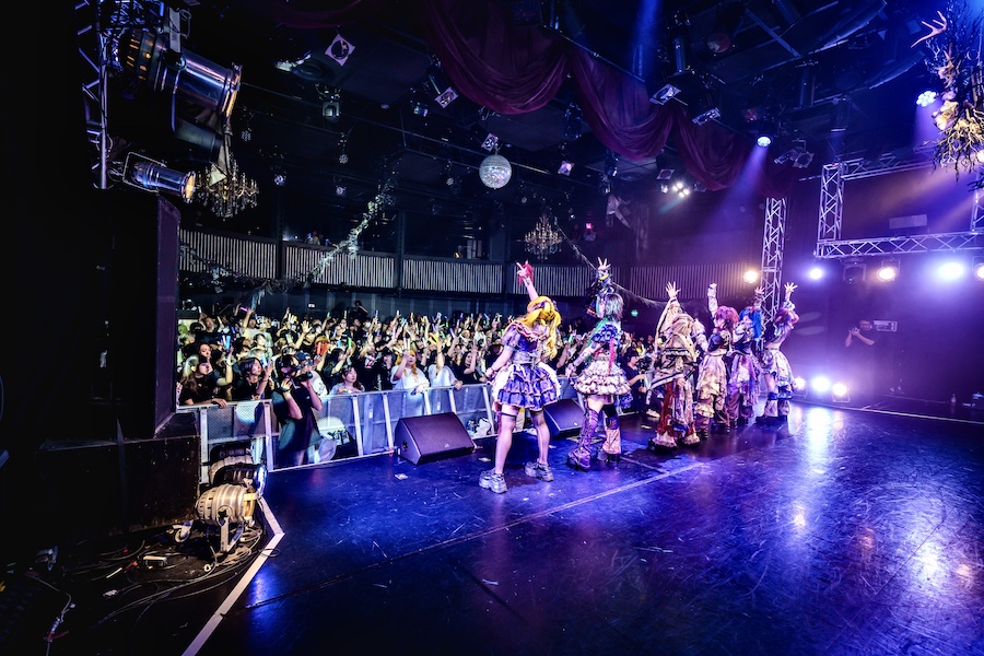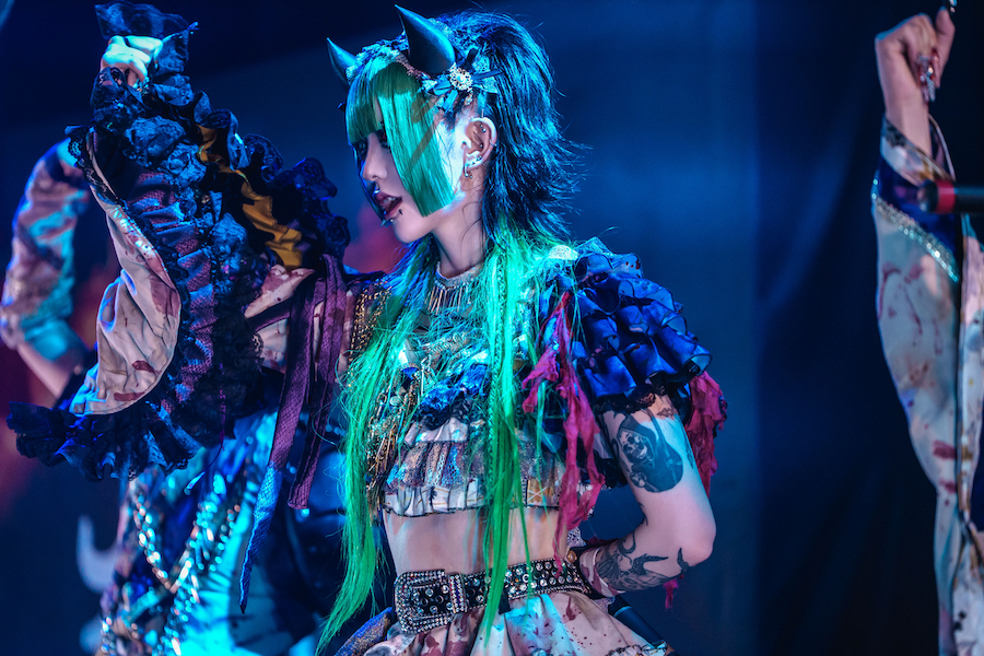 ツアータイトルと同じ「禁呪」と題された新曲の初披露でライブはスタートする。土着的な和のいななきが響き、怒涛のようにヘヴィなサウンドとブラストビートが猛り狂う曲だ。どこか明るい響きのするサビのメロディも印象的。激しさのなかに侘び寂びの情緒が見え隠れする。そのままアッパーなデジタルビートに乗せて「お慕い申し上げます」へ。米粉パンが暗い響きを持った声色を振るわせれば、メロがあっけらかんとした声で返す。髄狂アクは冷淡な表情で、朽壊レムは狂気の眼光で襲ってくる。凶暴性と猟奇性を重ねながら間髪入れずに「愛×食欲」に傾れこんだ。真鬼マナセがニヒルにフロアの熱を掴んでいく。