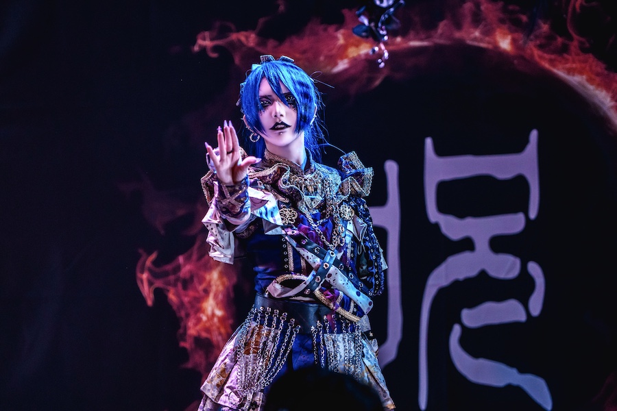 不穏なSEがけたたましく鳴り響き、幕が開く。後方には「禁呪」の文字が飾られ、シャーマニズムのシンボル、コウモリとトナカイの骨が吊るされているステージ。中央には新衣装を纏った臨戦体制の6人が構えていた。禍々しいサウンドをバックに、死ヰメロアンチが呪文のようにメロディを発すると、その声をかき消すように蛇喰ホムラの邪悪なシャウトが轟いた。