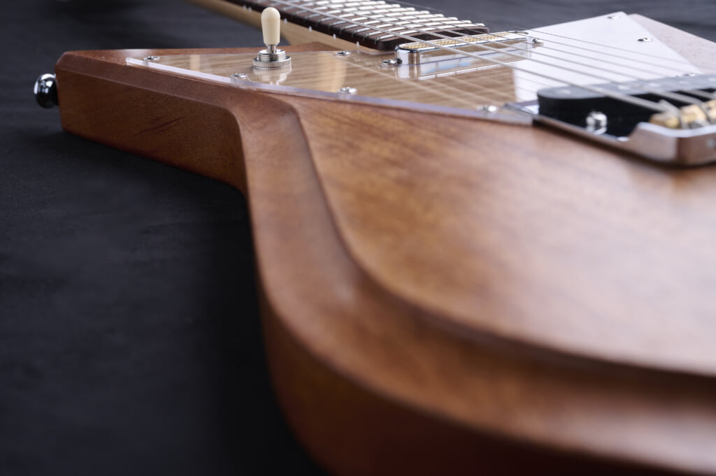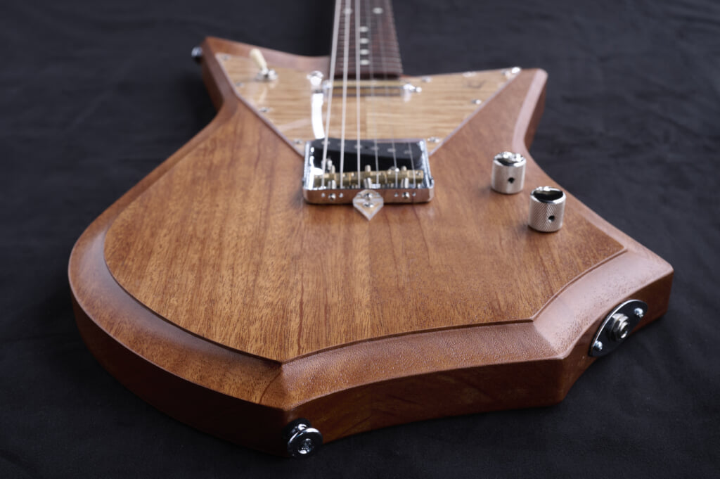ボディの外周をカットするジャーマンカーブ加工は、1950年代にドイツのギタールシアー/デザイナーのロジャー・ロスマイズルが考案し、リッケンバッカーのデザインに起用されていたものだ。モズライトにジャーマンカーブ加工が用いられているのも、創始者のセミー・モズレーが当時リッケンバッカーで勤務していたことに端を発するもの。クラフトマン片田は、これまでのコンペイトーシリーズで使用してきたアルダー材ではなくマホガニー材を使用するにあたって、デザイン的にも重量的にもジャーマンカーブ加工が吉と考えたようだ。