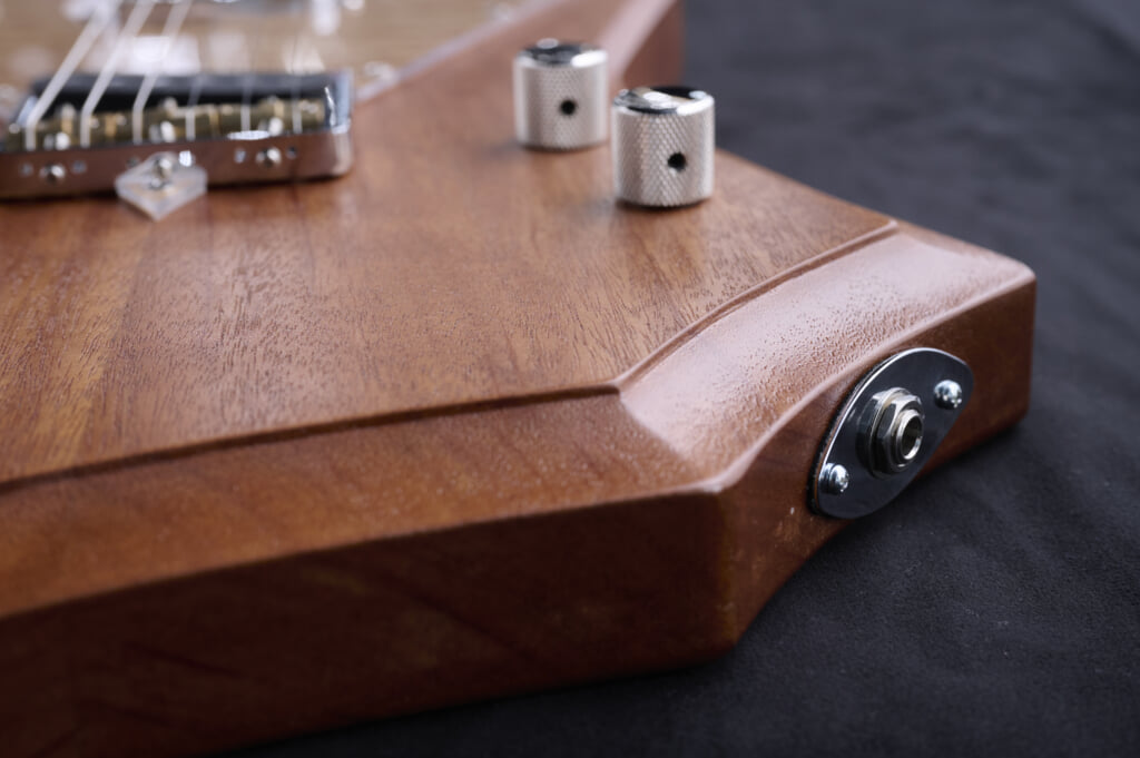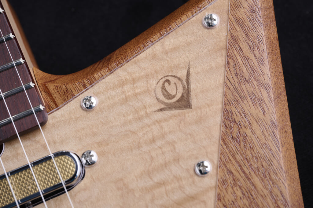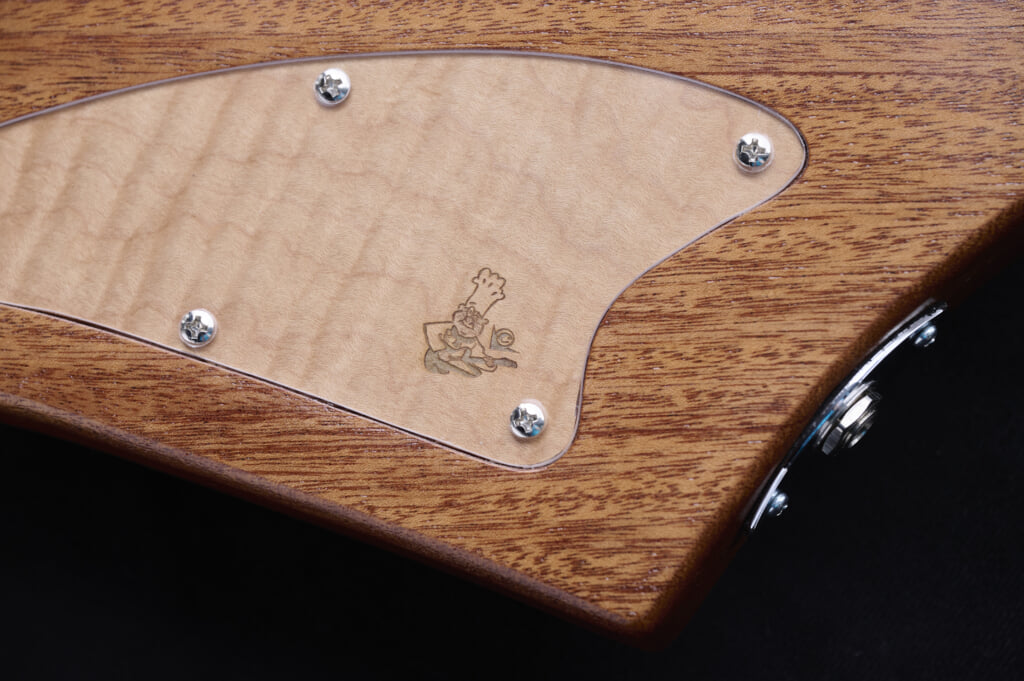 ウッディな質感が魅力的なモデルとなっているが、Vピックガードとボディ裏キャビティには、そのままメイプル材を使用するのではなく、天然のカーリーメイプルシートを透明なPET板で保護する形で仕上げられている。ロゴマークは焼印で入っており、特別感も満載だ。