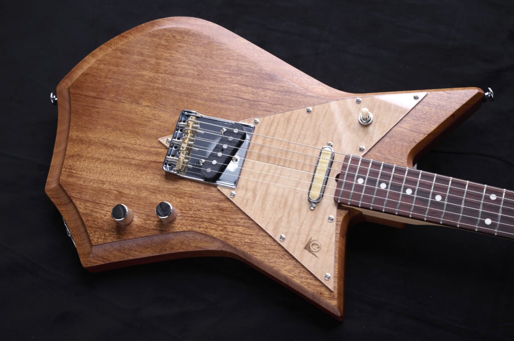 フロントピックアップはCGKの人気機種V3と同様のRoswell Goldfoilシングルがマウントされ、マホガニー材と相まって中音域の押し出しが素晴らしいという。音の粒立ちもレスポンスも素早いが、国産シングルをマウントしたリアにおいても程よい高音で耳に刺さることもない。