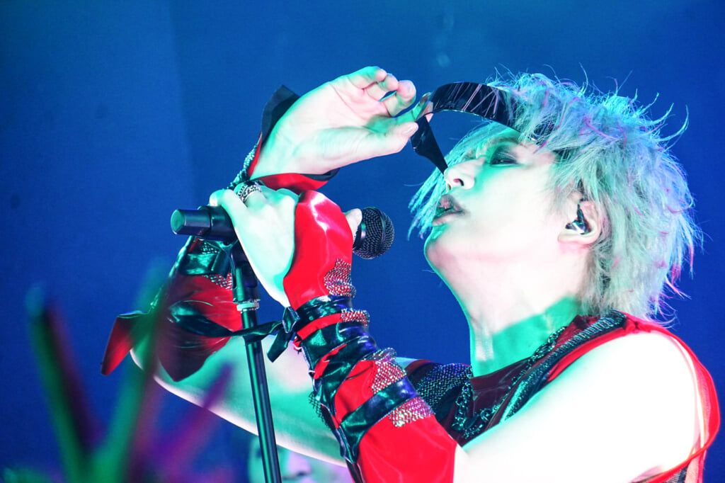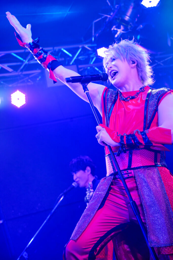 ライヴタイトルの通り、“真夏の宴の支配者”はmichi.だ。ミラーボールの光がキラキラと反射する中、切なくも幻想的な「THE WORLD IS YOURS」(ALICE IN MENSWEAR)を歌い上げ、指先まで神経を張り巡らすアクトも美しいバラード「真夏の夜の夢」(S.Q.F)へと繋げていく。