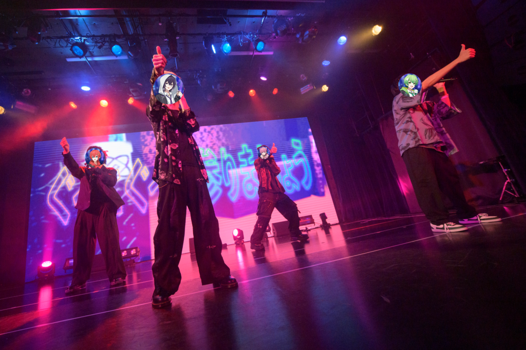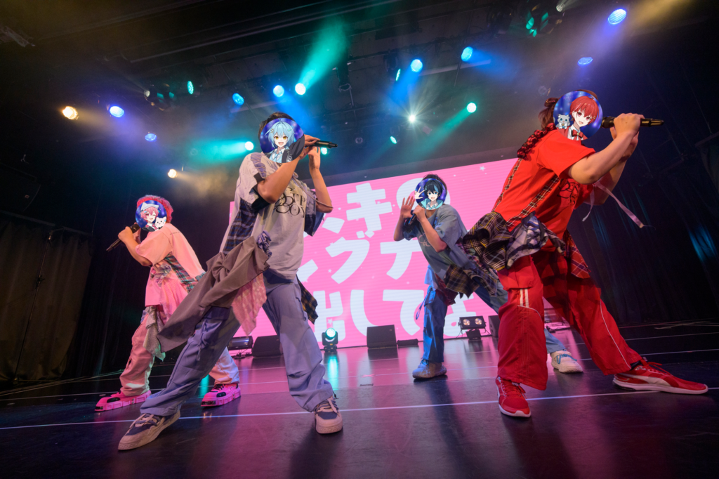 「みんなでこのライブ、作ってます。だからリスナーさんたち、余すことなく受け取ってください!」という十六夜ルクスの煽りから、後半戦スタート。「ストロベリー☆プラネット!」では、しぶらいんが「サインボールを投げるから、みんな全力でアピールしてね!」とリスナーに伝える。曲の合間にボールを投げるメンバーに、リスナーがペンライトで推しカラーをアピールしていた。続く『苺色夏花火』もメンバーを交代して、同様にサインボールのプレゼント。「ファタール」は灰染凜とせーあのユニットが会場を2人の色に染め上げる。あまねのデスボイスが印象的な「ヒバナ」に関しては、「この曲は昨日まで、あまねは音声で参加していたんだよ。やっぱり生だと違うね」と、はりまが秘話を伝えた。