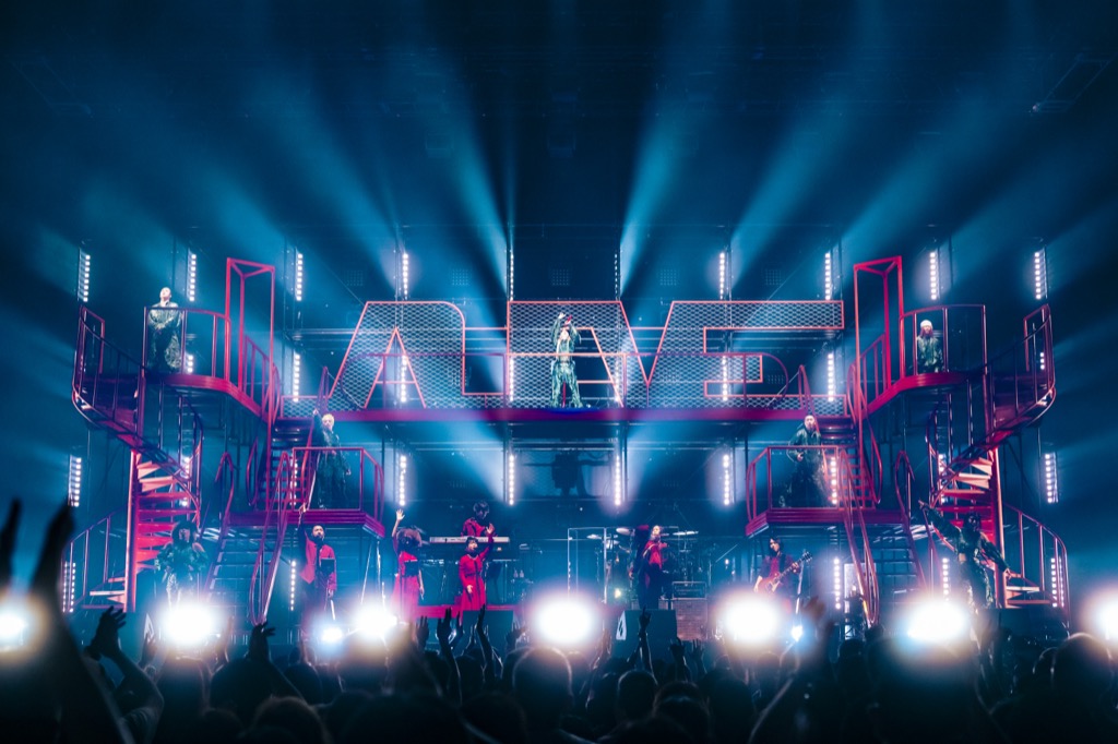 いよいよ定刻になり本公演がスタート。“ALIVE”の文字があしらわれた、3階建ての大規模なセットを登るようにして、AIが登場する。「みんな元気ですか!思い切り楽しんで帰ってね!」と挨拶し、ベストアルバム『25th THE BEST – ALIVE』の収録曲を中心に披露していく。日本屈指のダンスチームとして知られる KADOKAWA DREAMSが、参加しているのも見どころで、中心メンバーのMINAMIは、2022年の全国ツアー<AI “DREAM TOUR”>にも出演しており、今回の参加はその縁によるもの。AI自身も、フォーメーションのトップに立ちパフォーマンスを披露していく。