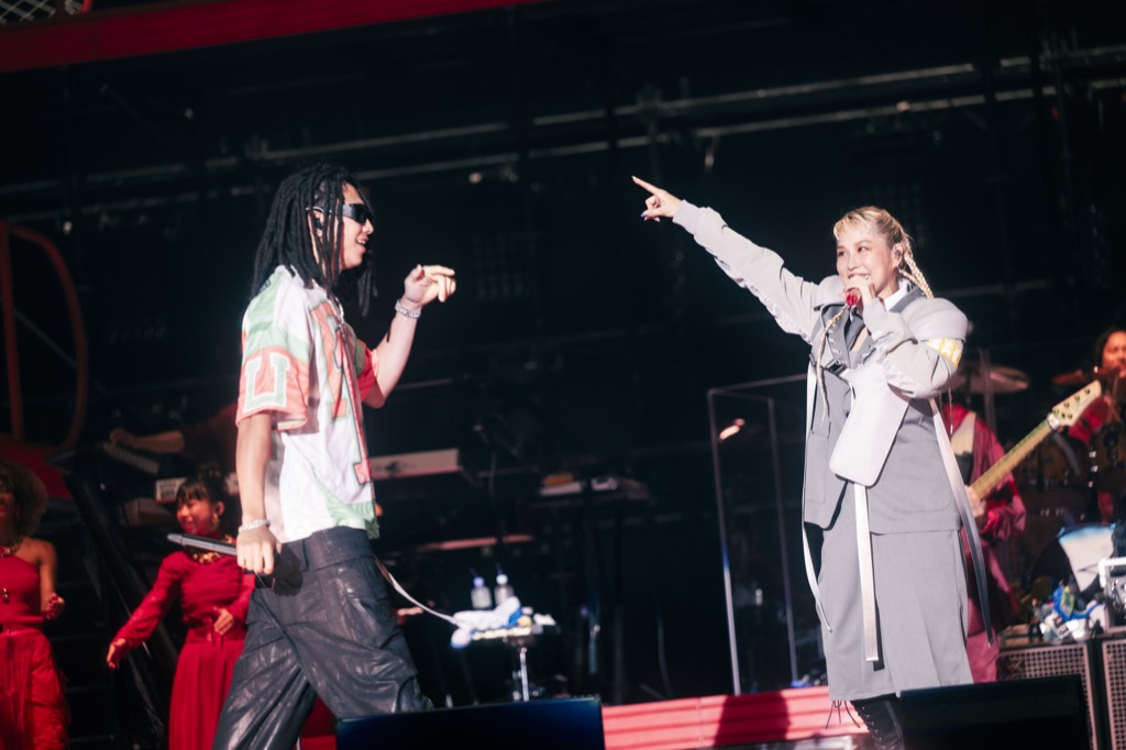 ライブ序盤のハイライトとなったのは、AIとゲストアーティストによる息の合ったコラボステージ。ライブ序盤、「ワレバ」の曲終わりに同時に「PUSHIMとDABOが来てくれたよ!」と呼び込み、昨年リリースした「Untitled feat. PUSHIM, DABO」が始まった。オーディエンスからも一際大きな歓声が上がる。切なくもさわやかなサマーチューンを終えると、AIはうれしそうに二人の肩を組み、PUSHIMとDABOは客席に投げキッスをふりまきながらステージを去った。