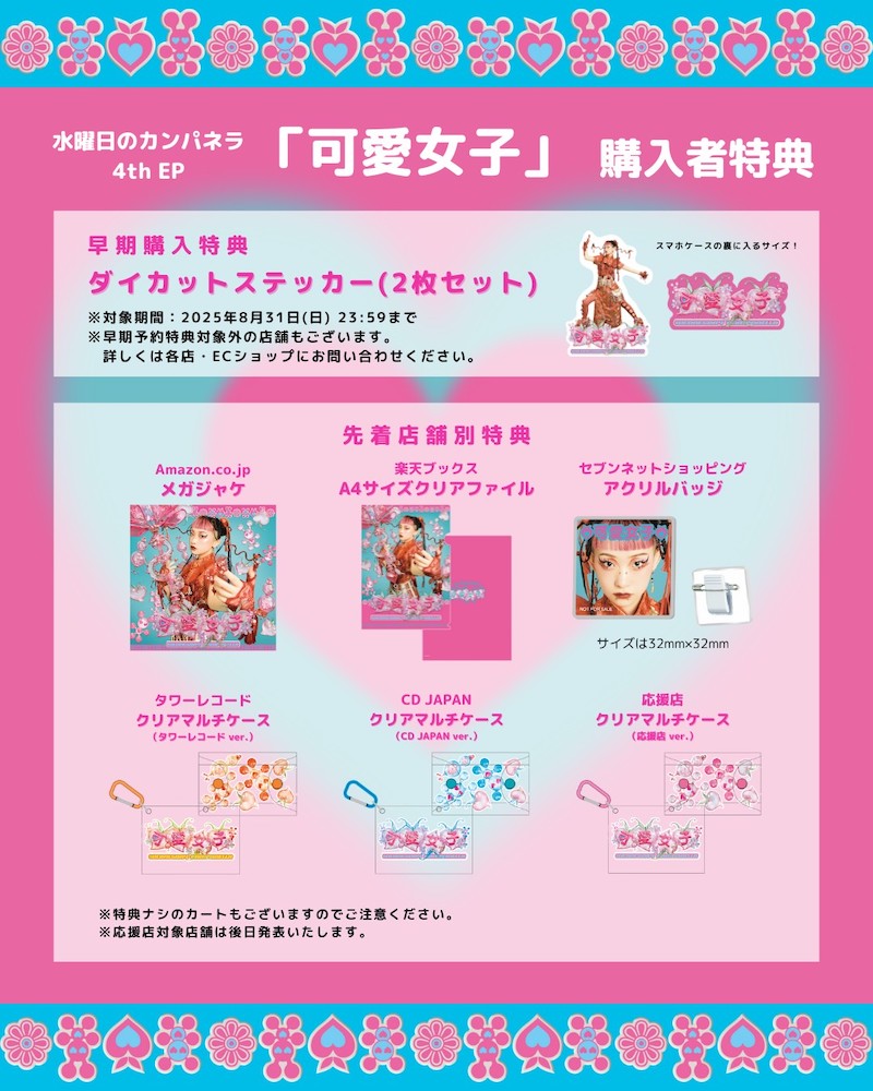 あわせて本日、『可愛女子』の収録曲順、早期購入特典、店舗別購入特典の絵柄も公開された。さらに、リリースを記念し10月11日には西宮で、10月13日には立川でリリースイベントの開催が決定。フリーライブとCD購入者対象のサイン会が予定されている。