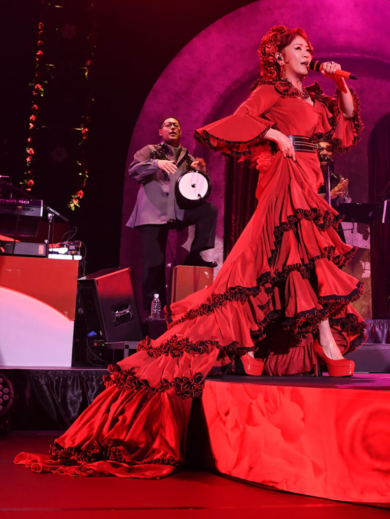 アルバム『55 BLACK』が会場に流れるなかで始まったオープニングは、この日デジタルリリースがスタートしたばかりの「Mira mira mira」。同楽曲は<55RED>ツアーおよびアルバム『55 BLACK』のリードトラックだ。いきなりフラメンコの世界に引き込まれると同時に、ベーシックのバンド10人、SIROCOによって選び抜かれたフラメンコユニット5人という大編成、そしてまるでスペインのアンダルシアに瞬間移動したかのような演劇的演出で、今までの大黒摩季のライブでは見たことのない異空間が表現された。