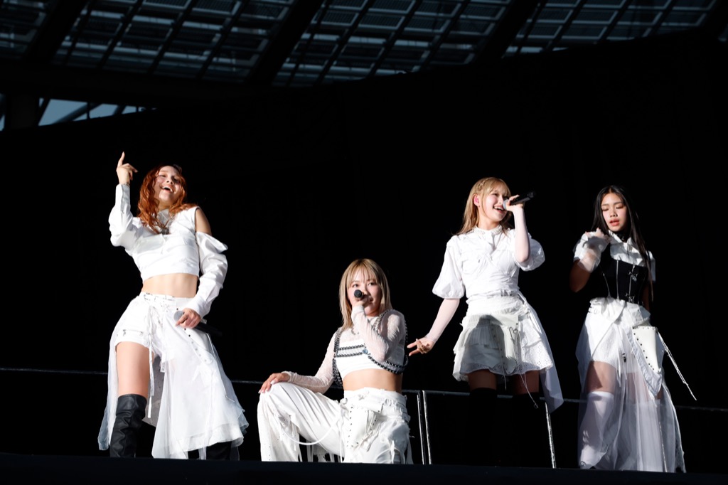 ステージではデビュー曲「Butterfly」と新曲「Your Jealousy」を続けて披露。「Butterfly」では力強く伸びやかな歌声とハーモニーで観客を圧倒し、続く「Your Jealousy」では真夏のフェスにふさわしい煌びやかなダンスナンバーで会場の熱気を高めた。