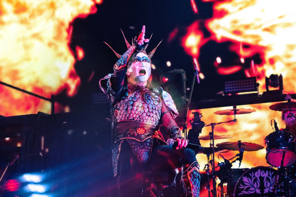 BABYMETALが怒涛のパフォーマンスで会場を揺るがした直後、暗転。巨大スクリーンに不穏なノイズが走り、重低音が地鳴りのように響き渡る。「聖飢魔Ⅱがやってくる」そんな予感が観客の胸を掻き立てた瞬間、ステージ中央から轟音と共に聖飢魔Ⅱが姿を現した。