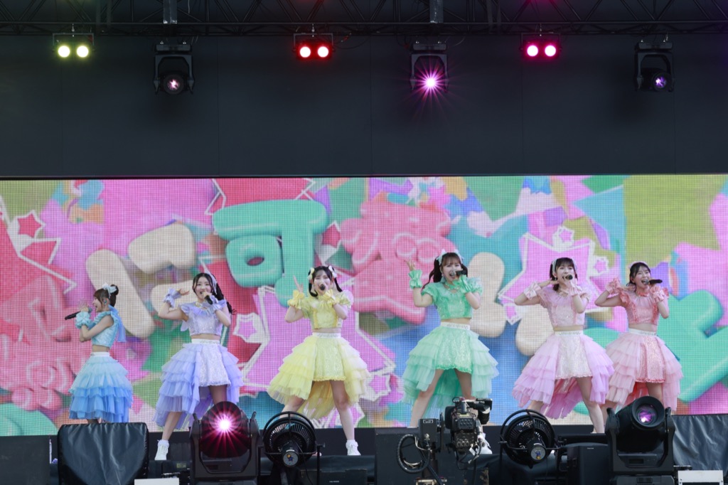 超ときめき♡宣伝部は、メンバーカラーのパステル調ドレスで、ときめきいっぱいのステージを展開。くるくる変わる豊かな表情で最新曲「超最強」を届け、オーディエンスと「かわいい!」のコール&レスポンスを繰り広げていく。「ここからは私たちと一緒にときめきトレイン作りませんか?」と始まった「初恋サイクリング」では、6人で列になり、キュートな動きと笑顔で彼女らの十八番である“好き”の気持ちを直球アピール。<a-nation>初出演の喜びを語って、坂井仁香が「今日は、この会場のみなさんに、たくさんときめいてもらえるように頑張ります!」と宣言してからは、「世界でいちばんアイドル」でファンへの感謝を歌い、「トゥモロー最強説!!」では花道の先まで出て客席に大きく手を振る。最後は代表曲「最上級にかわいいの!」で、オーディエンスのハートをロックオンしてみせた。