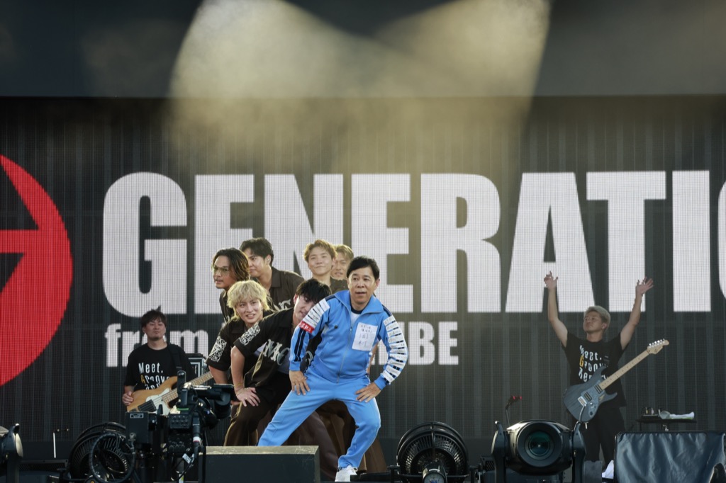 繰り返される「GENERATIONS…」のアナウンスに、美しいピアノの音が流れると、GENERATIONSの6人がステージ高くにリフトアップ。バンドの生演奏をバックに、「Evergreen 2.0」を清涼感たっぷりに届けていく。続く客席との「GENERATIONS!」のコール&レスポンスを繰り広げた「ALRIGHT! ALRIGHT!」など、曲中にアクロバットを交えたダンスパートが組み込まれているのがGENERATIONS流。水分補給を促すMCのあとは「暑苦しい夏に涼しくなってもらいたい」と、数原龍友がプロデュースを担当した「Summer Vacation」を贈り、ハッピーなサーフロックで場内のテンションを上げていく。そして「Choo Choo TRAIN」に続こうとしたところで、突然、ナインティナインの岡村隆史が「オカレーションズです!」とステージに乱入。岡村を先頭に「Choo Choo OKAMURA TRAIN」を披露した。岡村が繰り出すダンスに合わせてメンバーも振りを変え、最後は昔キッズダンサーとして岡村と共演経験のある小森隼が岡村をお姫様抱っこ。スタジアム中が湧いた意義深いサプライズのあとは花道を駆けながら「Y.M.C.A.」をオーディエンスと共に踊り、「NOW or NEVER」ではしゃがんでジャンプ!を繰り返して、熱い一体感を生み出していった。