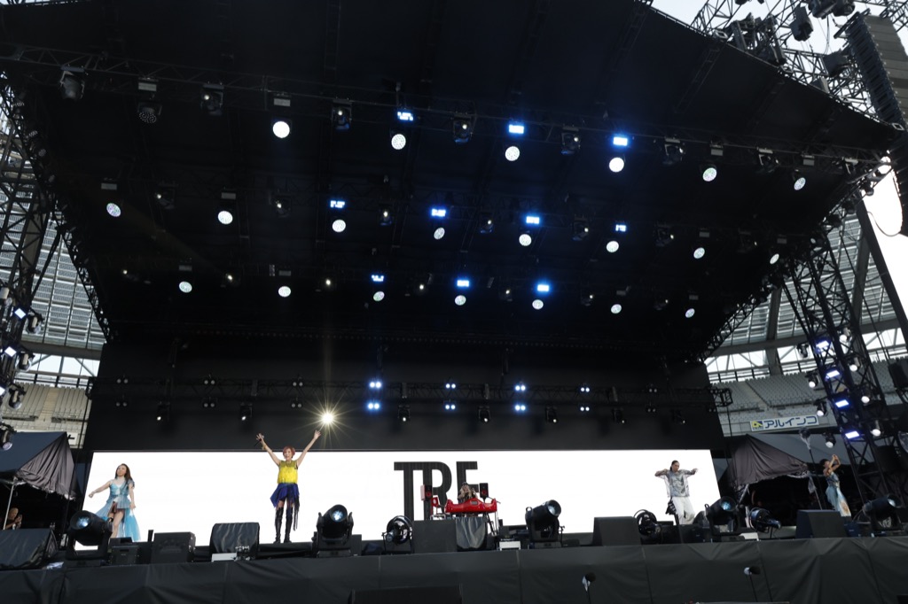 開演から5時間を経たところで<a-nation>20回目の出演となるTRFが登場。「この曲、聞いたことある人! この曲、全部わかる人!」とYU-KIが煽って始まった「BOY MEETS GIRL」では、オーディエンスが大きくうちわを振って一斉に応える。YU-KIのボーカルはデビューから30年超を経ても変わらぬ艶を放ち、間奏ではSAMが見事なステップを踏み、ETSUとCHIHARUも花道へと疾走。「さぁ、今年の夏も最高に盛り上がっていこうぜ!」とDJ KOOが煽ってからの「EZ DO DANCE」でも、客席中のうちわが大きく揺れて、色褪せない名ディスコチューンの輝きを証明していく。20名を超えるサポートダンサーも加わり、華やかにステージを彩るなか、オーディエンスに手を振るメンバーの満面の笑顔がまぶしい。2006年の活動再開時にリリースされた「Where to begin」では、ダンサーであるSAM、ETSU、CHIHARUの見せ場もしっかり用意され、プロフェッショナルのパフォーマンスで度肝を抜く場面も。「『a-nation』でひとつになろう!」とDJ KOOが号令をかけての「survival dAnce~no no cry more~」では、見渡す限りの青いうちわの海に「こんなに暑いなか『a-nation』に集まってきてくれて嬉しかった、ありがとう!」とYU-KIが感謝。最初から最後までステージを駆け回り、会場の隅々にまでTRFを届けようとする気迫あふれるパフォーマンスで、レジェンドの底力を見せつけた。