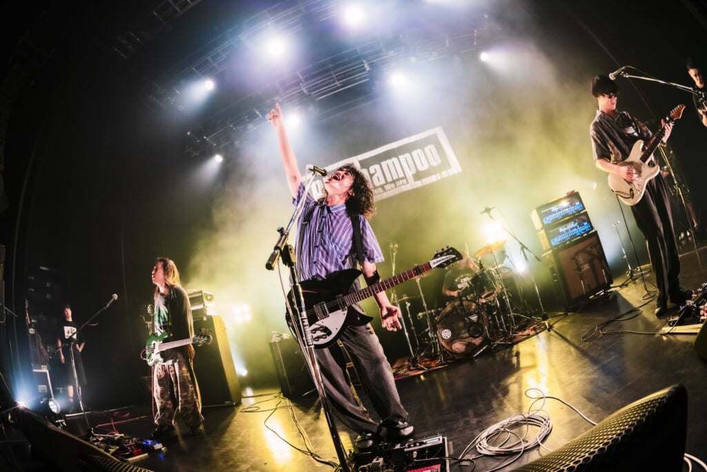 さらにエレアコを背負ったヤマトの弾き語りで始まり、楽曲風景を丁寧に描いた「第三種接近遭遇」から、たっぷり気持ちを込めた演奏とヤマトの切ないハイトーンが胸を締め付けた「東京外環道心中未遂譚」と続く心揺さぶる展開や豊かな表現力は、彼らのライブスキルの高さを表すと同時に、近年のPK shampoo楽曲の充実ぶりも証明。「歌えます? 俺、あんま歌詞覚えてないねん」と始まった「3D/Biela」の大合唱で一体感が生まれると、「えらいことやで。いつも間違えんねん、この曲」と照れや嬉しさを隠すようにヤマトが笑う。