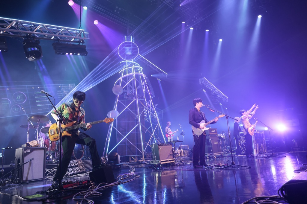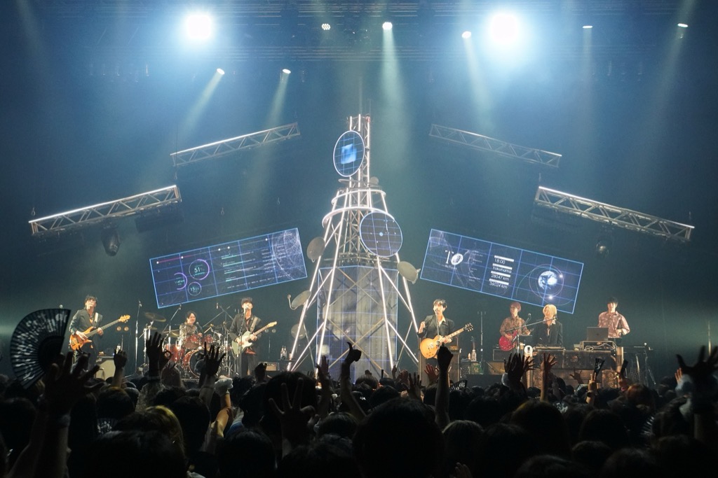 開場時にまず多くのファンが注目したのは、ステージ中央にそびえ立つ塔のようなオブジェだ。まるでホールやアリーナでのワンマンライブのようなSir Vanityらしい遊び心が感じられる壮大なセットに、開演を待つファンの期待値も高まっていく。Sir Vanityのライブは、毎回セットのデザインやライブの構成で、タイトルやコンセプトの世界観を体現しているところが大きな特徴。強烈なインパクトを与えた今回の塔のオブジェは、Sir Vanityの5年間の活動が交差し、時間や空間を超えて繋がる基地局を表現しており、集まったファンの思いを電波として吸収し、新たな世界線を生み出していく…。今回の“TO”はそんなメッセージも含んだライブとなっていた。