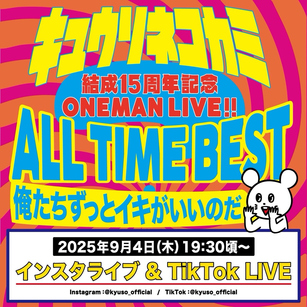 また、9月4日(木)に“なんばHatch”で開催される結成15周年記念ワンマンライブ<- ALL TIME BEST 俺たちずっとイキがいいのだ->から数曲をInstagram&TikTokで生配信することが決定した。こちらは4日19時30分頃から配信予定とのこと。