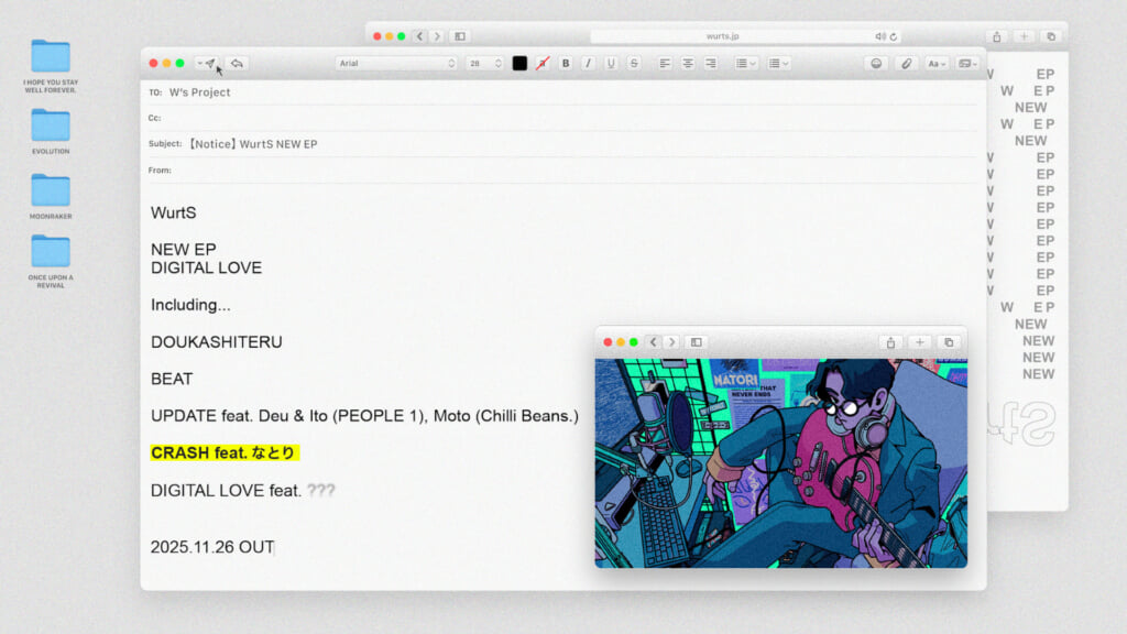 WurtSが11月26日、ニューEP『デジタル・ラブ』をリリースする。同EP収録新曲「クラッシュ feat. ???」のゲストアーティストがなとりであることが発表となった。