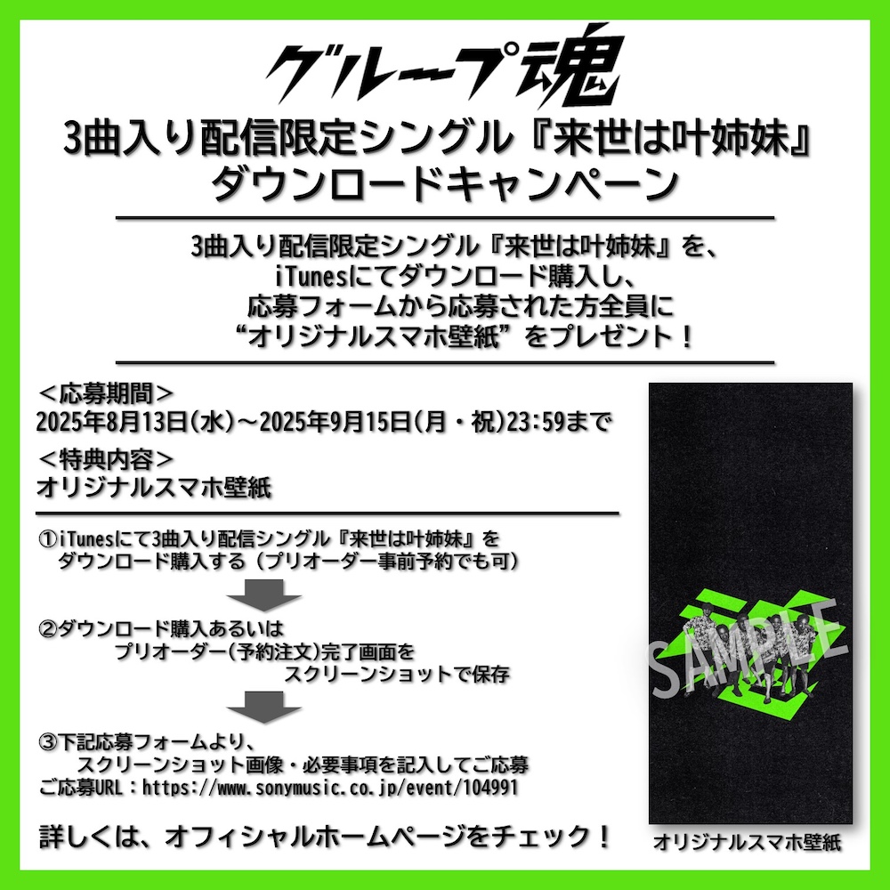 配信シングルリリースを記念して、配信中の3曲入り配信限定シングル「来世は叶姉妹」を、iTunesにてダウンロード購入し、応募フォームから応募すると、“オリジナルスマホ壁紙”がプレゼントされる。実施期間が9月15日23時59分までとなるので、ぜひ早めに応募してほしい。