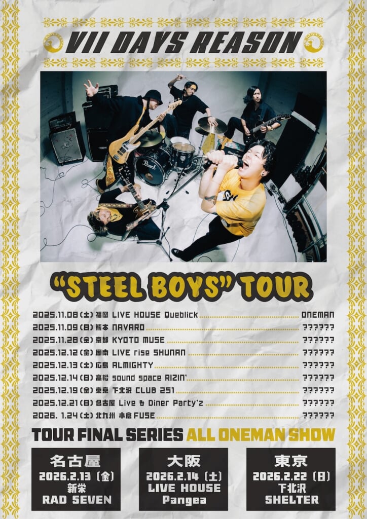 そしてアルバムリリースに合わせて、<VII DAYS REASON ”STEEL BOYS” TOUR>と題し、2025年11月からリリースツアーの開催も発表されており、バンド初となる東京・名古屋・大阪・福岡でのワンマンを含む、全12公演行われ、他公演のゲストは後日解禁となる。