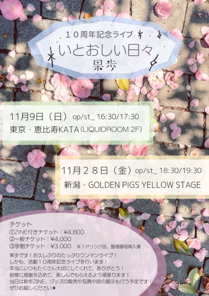 そして、果歩が音楽活動10周年を迎えた今年、<果歩 10周年記念ライブ “いとおしい日々”>と銘打った自主企画ワンマンライブが開催される。東京公演は11月9日(日)恵比寿KATAにて、新潟公演は11月28日(金)新潟GOLDEN PIGS YELLOW STAGEにて開催。弾き語りでのライブのほか、写真や詩の展示なども予定されている。