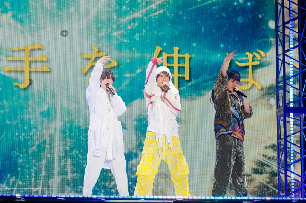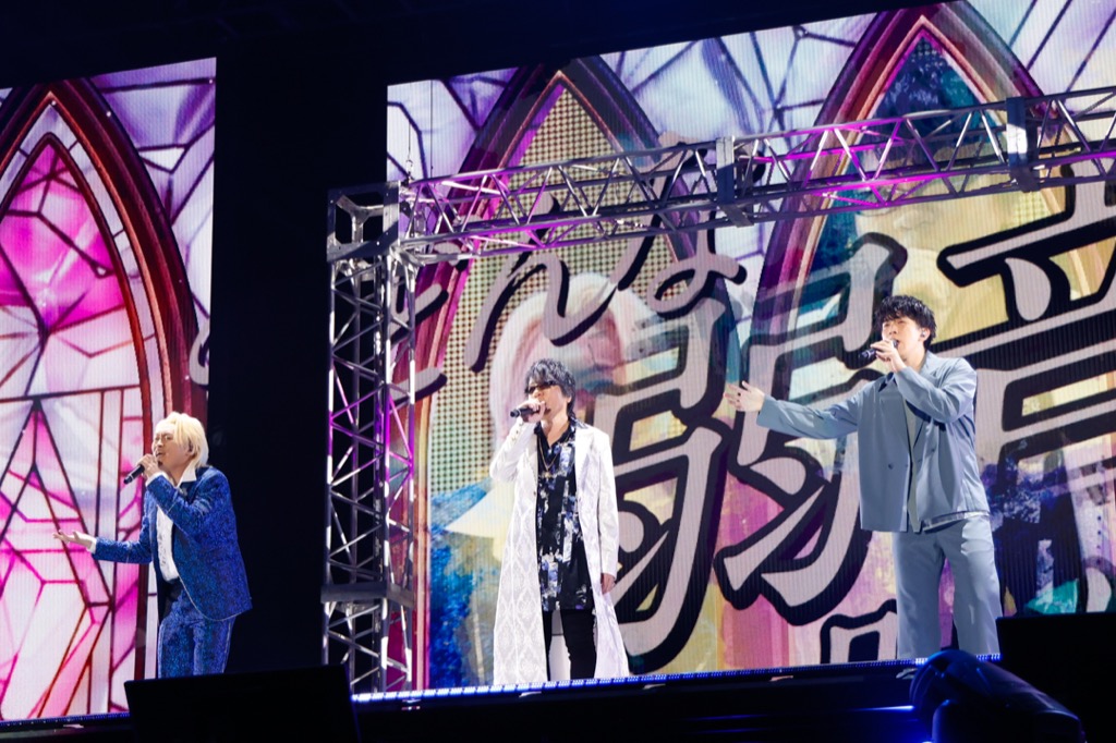 Fling Posseの黄色、麻天狼のグレーという、それぞれのテーマカラーのレーザーが交差し、開幕を告げた今回のライブ。ステージにはFling Posseの3人(飴村 乱数を演じる白井悠介、夢野 幻太郎を演じる斉藤壮馬、有栖川 帝統を演じる野津山幸宏)と、麻天狼の3人(神宮寺 寂雷を演じる速水奨、伊弉冉 一二三を演じる木島隆一、観音坂 独歩を演じる伊東健人)が一挙に登場。観客からは大きな歓声が上がる。
