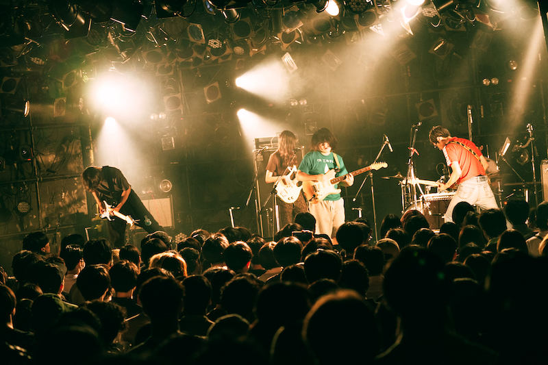 「Imagine Siblings」へ連なった「Sunbeetle」では、ハウリングを合図に近藤大彗(Vo, G)の歌唱が叫びへと転化していく。単語の意味はもはや極限まで漂白され、ただ何かをシャウトしているという事実が、否応なく身に迫る。フラフラと舞台上でぶっ倒れたり、深く被っていたキャップを放って喚く近藤の様子は情けないほどに赤裸々で、だからこそ我々も彼らの声に耳を傾けんとするのだろう。