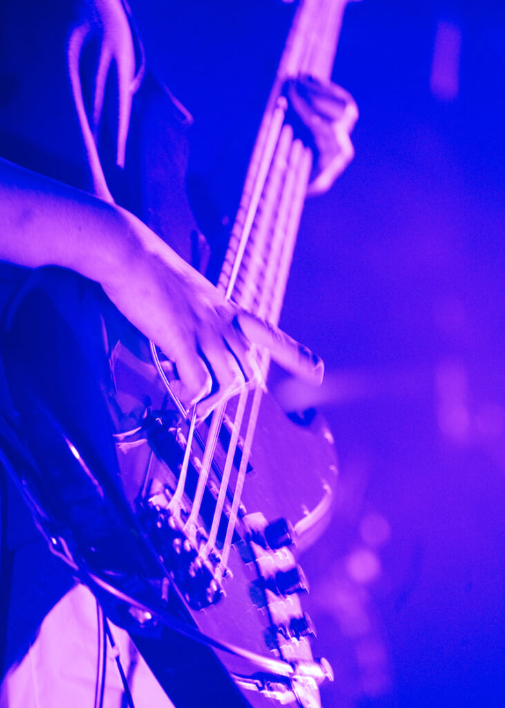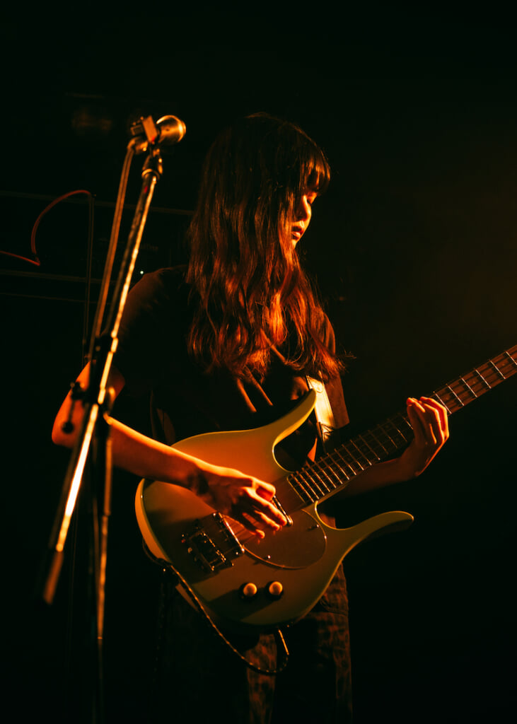 トリプルギターがざわめき、会場を満たした「Uni」を経てドロップされた「Our Broken Promises」も、No Busesの作品群がリスナーを惹きつける理由を象徴。ロングトーンをスローに鳴らす3本のギターが土台を形成すると、その隙間に近藤の歌が配されていく。3本のギターが前景化する分、歌唱は鳴りを潜めるのだが、雲の隙間からそっと光が降りるみたいに言葉が確かに顔を出してくるのである。