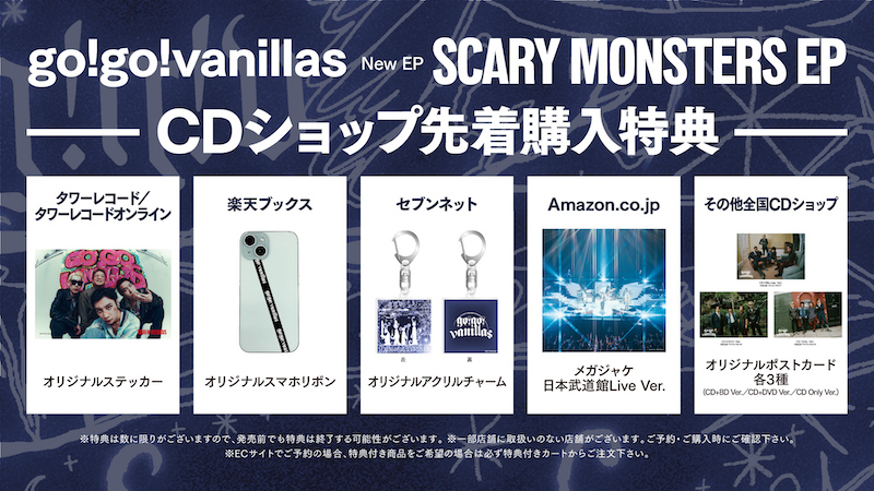 go!go!vanillas New EP「SCARY MONSTERS EP」を下記対象店舗でご予約購入いただくと、先着で店舗別オリジナル特典をプレゼントいたします。