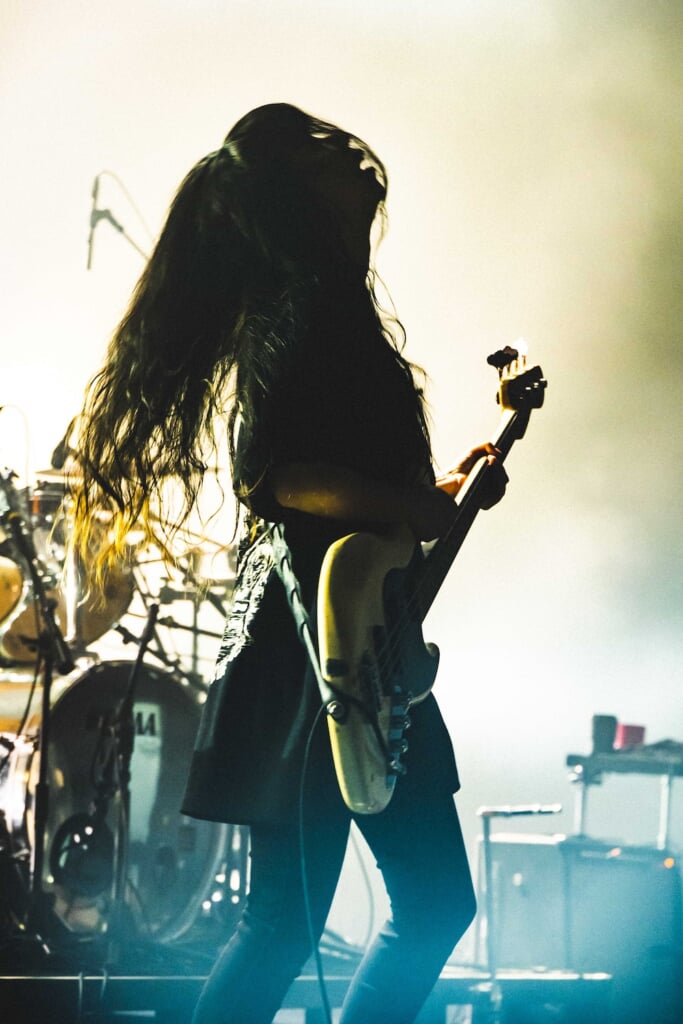 ノンストップで進んでいくステージ。そのセット中盤にて、ある意味ではストレートなモダンメタル的な曲がプレイされた。いまだ聴いたことのない本曲は、彼らの新曲にほかならない! 当然ながらローチューンのギターフレーズが轟き、京の強烈なボーカルが唸りを上げる。ただ低音フレーズであってもミヤの単音オブリはピッチもハッキリと聴き取れて、“何をやっているかわからないけどスゴい”というタイプの演奏ではないところに、これも彼の練度がうかがえる。もちろんantz、高松のプレイもそうで、“バンドが聴かせたい音”が明瞭にあることがわかる。