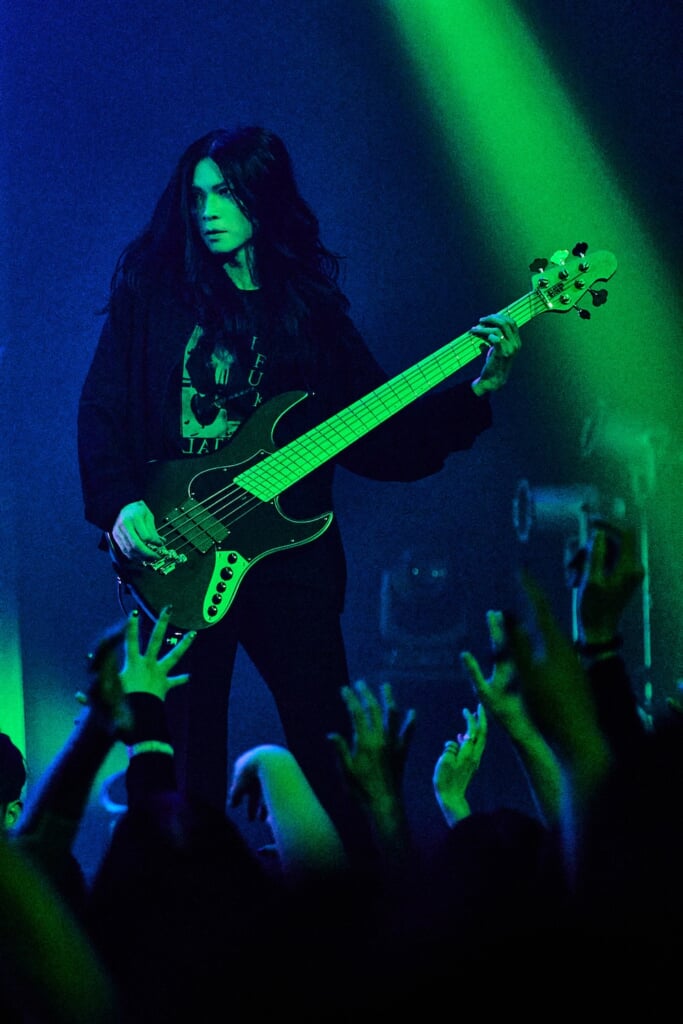 先の公演でも開演曲として選ばれた本曲。ファンもそのつもりだったのだろう、ドラムのフラムをきっかけに、のっけからモッシュにも近い勢いでステージに手を伸ばし、体を寄せていく。京も重心低くファンを煽り、それに対してファンはサーフで応えていく。ツインギターは7弦ギターならではの重いドライブ音を炸裂させ、アクションも大きくステージにて存在感を放つ。逆に高松は1曲目ということもあり、実直なローにて弦楽器をひとつにまとめる。ヴァースではハネ感も加わり、フロアは縦に横にと早くも大賑わい!