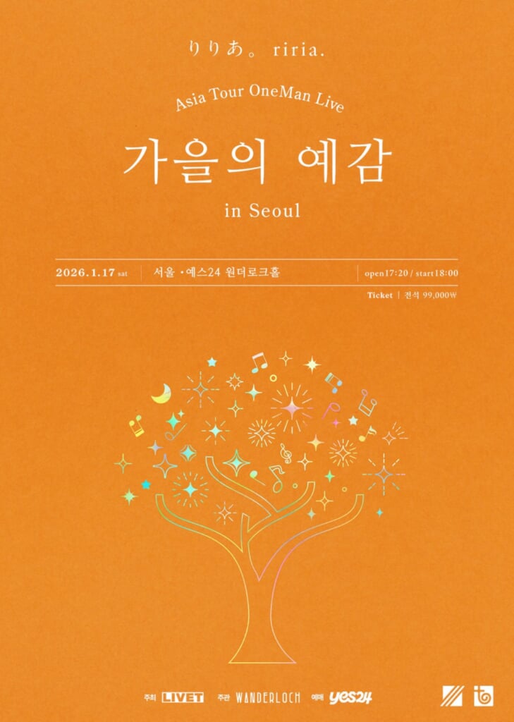 また、自身初の韓国ソウル公演<Asia Tour OneMan Live「秋の予兆」>(現地タイトル<riria. Asia Tour OneMan Live 「가을의 예감」 in Seoul>を2026年1月17日にソウル YES24 WANDERLOCH HALLで開催することが決定した。