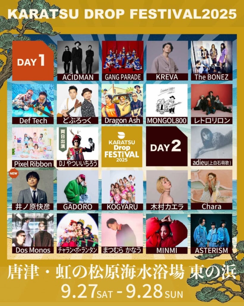 <Karatsu Drop Festival 2025>が9月27日および28日の2日間、佐賀県唐津市・虹の松原海水浴場 東の浜で初開催される。このたび同フェスのタイムテーブルが公開された。さらに、28日(日)には出演キャンセルとなったimaseに代わり井ノ原快彦の追加出演が決定した。