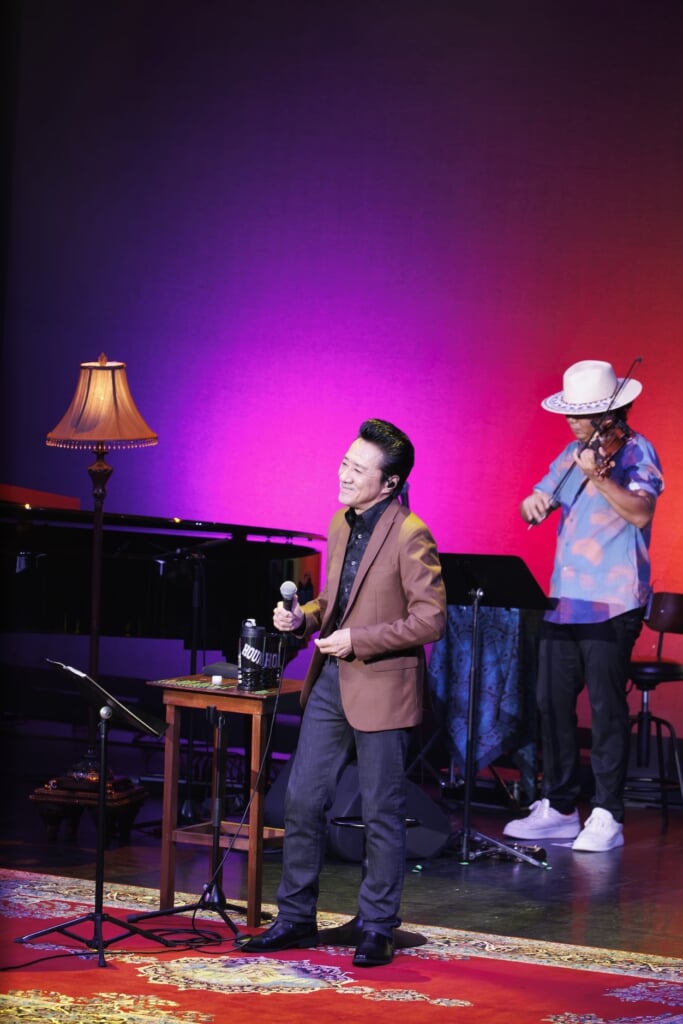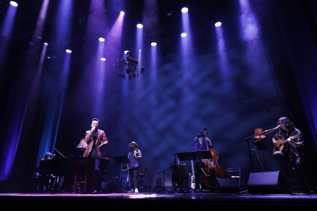2025年で3回目を迎える恒例の秋公演は、大友康平の自宅リビングに観客を招いたような温かな空間をコンセプトにしたものだ。ステージにはペルシャ絨毯やアンティーク調のライトが置かれ、曲ごとに異なる照明演出が施されるなど、居心地のよい雰囲気とともに楽曲の世界観を深めた。