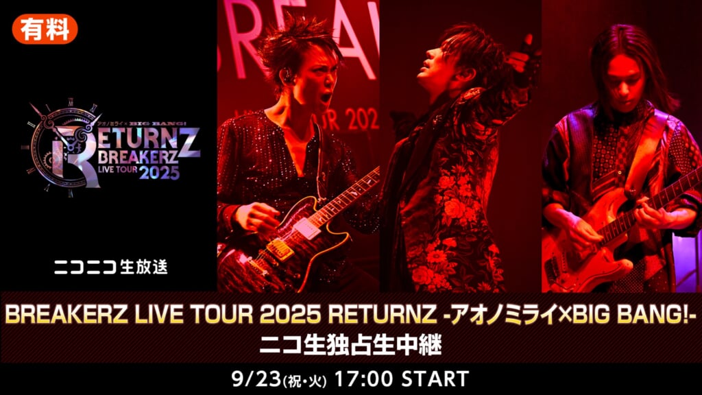 BREAKERZが9月6日から開催しているワンマンツアー<BREAKERZ LIVE TOUR 2025 RETURNZ -アオノミライ×BIG BANG!->より、9月23日に渋谷ストリームホールで開催される東京公演をニコニコ生放送にて生中継することが発表となった。