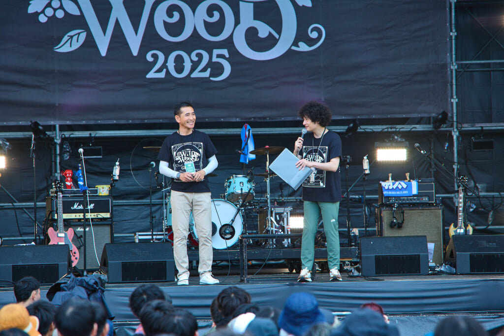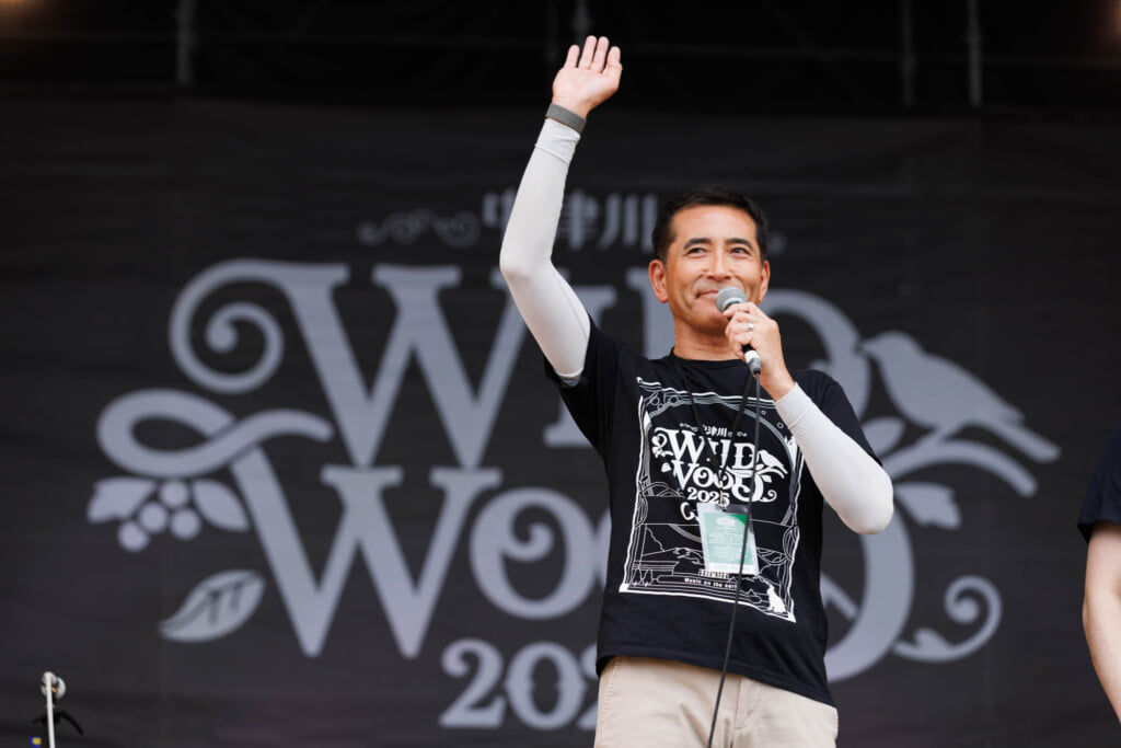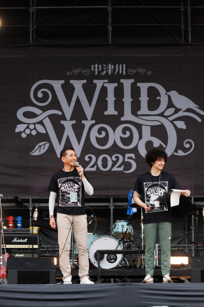 「ようこそ、中津川にお越しいただきありがとうございます。中津川市民を代表して、皆さんを歓迎いたします! 今日明日と、<中津川 WILD WOOD>、盛り上がっていきましょう! 2日間音楽を楽しみながら、自然豊かな中津川、そして栗きんとん、五平餅、いろんな食もみなさんを待ってます。天気に負けないように盛り上がっていきましょう! <中津川 WILD WOOD2025>、開会します!」
