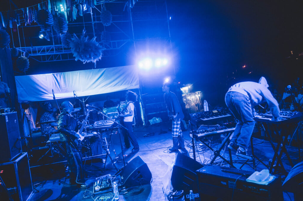 足を早めてステージに到着すると、観客が体育座りで彼らのリハの様子を見守っていた。それは何かの祝祭のようで、20時前という時間帯のせいもあり、独特な神秘性を帯びていた。これから起きようとしている非日常にさらなる興味を掻き立てられ、大人しく本番を待った。