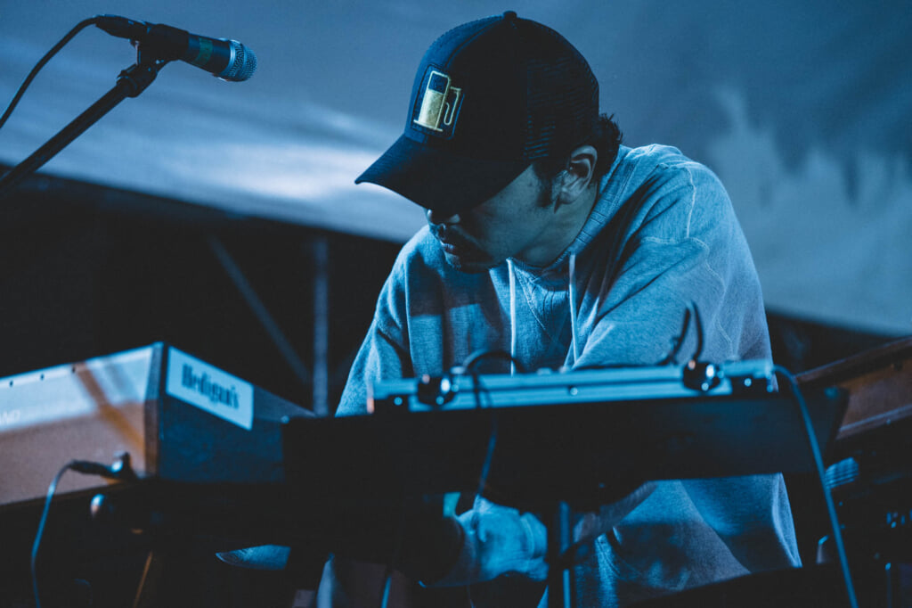 ブリーピーに鳴らされる規則的なシンセフレーズが牽引する「DAO」は、アシッドテクノのような手触りもありながら、ギターとドラムの大陸的で豪快な演奏によってロックンロールしている。そこには何がどう展開していくかわからないスリリングさがあり、当然、その楽しみ方も観客一人ひとりに委ねられている。立ち尽くしている者、周りの視線なんて構わずに踊りたいように踊る者、光るリストバンドを振り回している者。目に見える一体感はないが、全力で楽しむという一点においてはみんな同じで、それが異様な熱気を生み出していた。このステージの一帯だけ、世間から隔離されているようだった。
