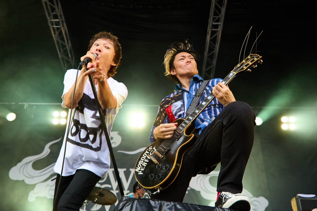 「俺たちが、天気と蝉の声を連れて来たぜ!ただね、晴れ過ぎるとお互いバテるじゃない?だからこの後若干、雲をご用意しています。なので、もう少し涼しくなると思うんだよね。そうしないと、クロマニヨンズまでもたないからさ。俺も楽しみにしてるんだよ」と、ユーモアたっぷりな宮田に笑いと拍手が沸き起こる。今年8月に対バンライブが実現したザ・クロマニヨンズも、この日出演するのだ。