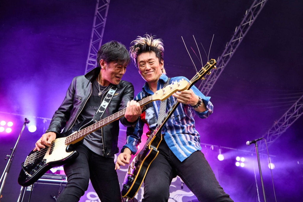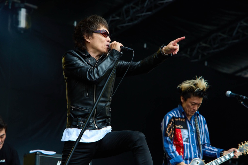 新曲への反応に手ごたえを感じた様子の宮田だが、「ここからは知ってる曲しかやりません!」と、不特定多数の音楽ファンを前にしたサービス精神たっぷりのMCから「いくぜ、中津川ー!」と叫んで「START」が始まったとたん、「うおぉ!」とオーディエンスからドッと歓声が上がり、手拍子しながらサビの大合唱となった。キース・リチャーズばりにギターを低く構えた森は、ステージ前に出て味わい深いソロプレイ。この曲には直線的なイメージを持っていたが、意外とルーズなグルーヴが感じられたのは、45周年というキャリアが醸し出す色気だろうか?大きなサウンドで包み込むように歌われた「悲しすぎる夜」の間奏で、宮田がステージ端まで足を運び、両手を上げてファンの声援に応えるなど、ファンへの感謝と愛情が随所で感じられた。