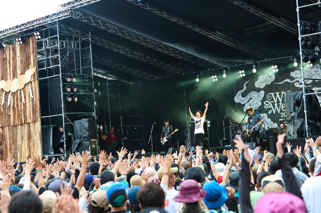 森、小林がサポートメンバー市川勝也(Ba)と共に登場すると、森が勢いよく「1、2、3、4!」とカウントしてかき鳴らしたギターから、「MY GENERATION」の演奏が始まった。サングラス姿の宮田が袖から勢いよく飛び出してくると、大歓声で迎えるオーディエンスたち。WONDER WALLはステージ前までギッシリ人だらけで、ライブハウスさながらの密度だ。ステージ前に身を乗り出して歌う宮田と共に歌う人たちの大きな声が、周囲に伝わりさらに人が集まってきた。続いて始まった代表曲の1つ「歩いていこう」では、サビのコーラス「oh oh oh~」でますます結束を高めるバンドとファンたち。「まだまだいくぞ~!」と叫んで、疾走感溢れる「JACK&BETTY」へと進む。宮田は上着を脱いでTシャツ姿になり、「後ろ~!」「中津川~!」と煽りながら歌い、小林の重たいドラム、森のソリッドなギター、市川のベースが音の塊になってオーディエンスを牽引する。じつは本番前のサウンドチェックで「じゃあ、リハーサルいくか!」と、「Let’s Go ヒバリヒルズ」が飛び出したことで、ライブ開始と共に既に一体感が出来上がっていたのだが、本番開始となるとさらに盛り上がるのだから、バンドもファンもエネルギッシュにもほどがある。