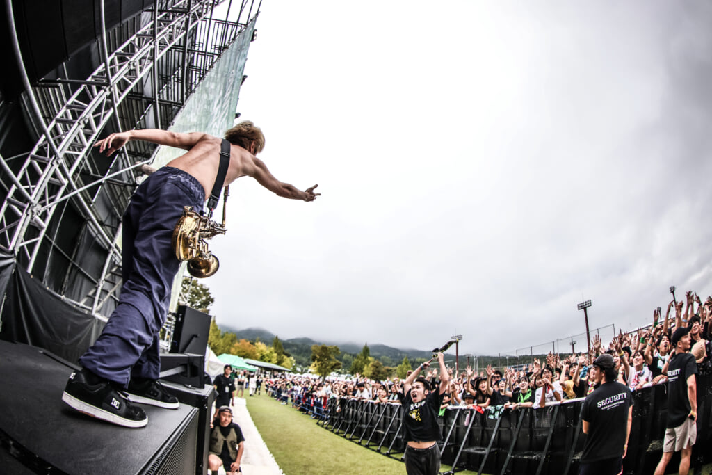 SEに合わせてクラップと歓声が沸き起こる中、猪狩秀平(Gt, Vo)、YUJI (Vo, Ba)、満(Sax)、Task-n (Dr)、イイカワケン(Tp)、サポートメンバーUME(Tb)がステージに上がる。猪狩による「ヤッホー! 来たぜ、中津川!」のひと吠えから、ホーンセクションが高らかに号砲一発、「Dandadan」がスタートした。轟音と一糸乱れぬリズムセクション、YUJI、猪狩の歌声が煽情的にオーディエンスに火を点け、続く「Be The One」ではステージ前でモッシュの嵐となった。