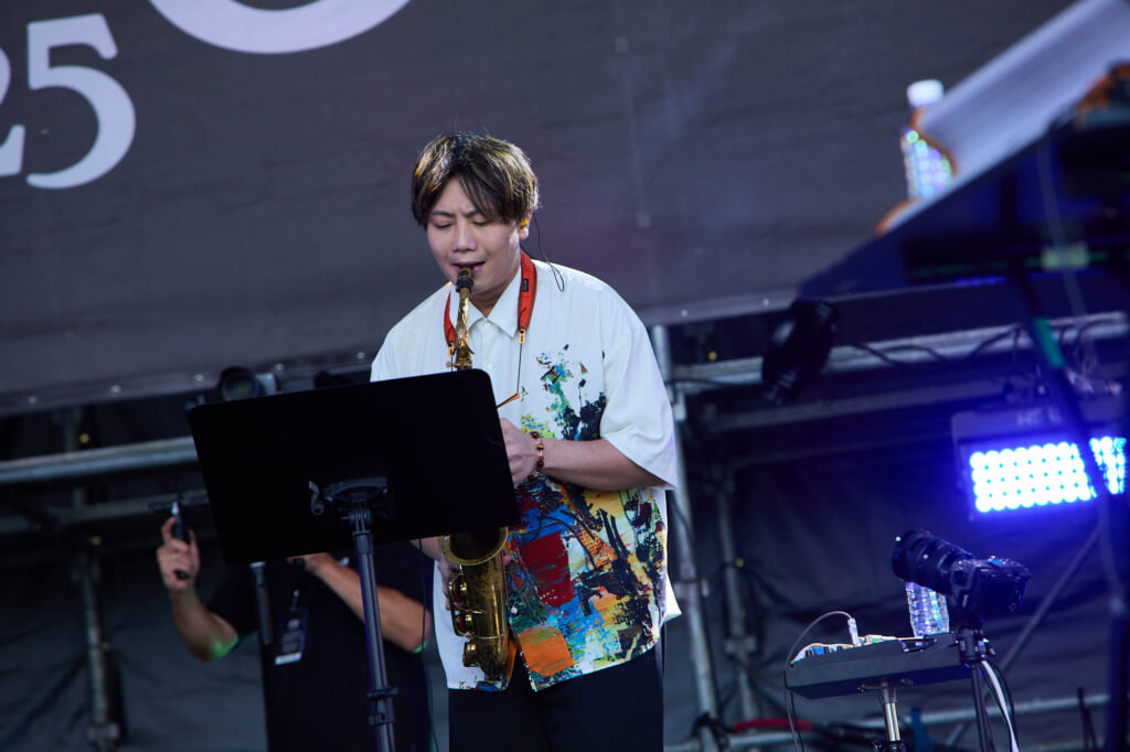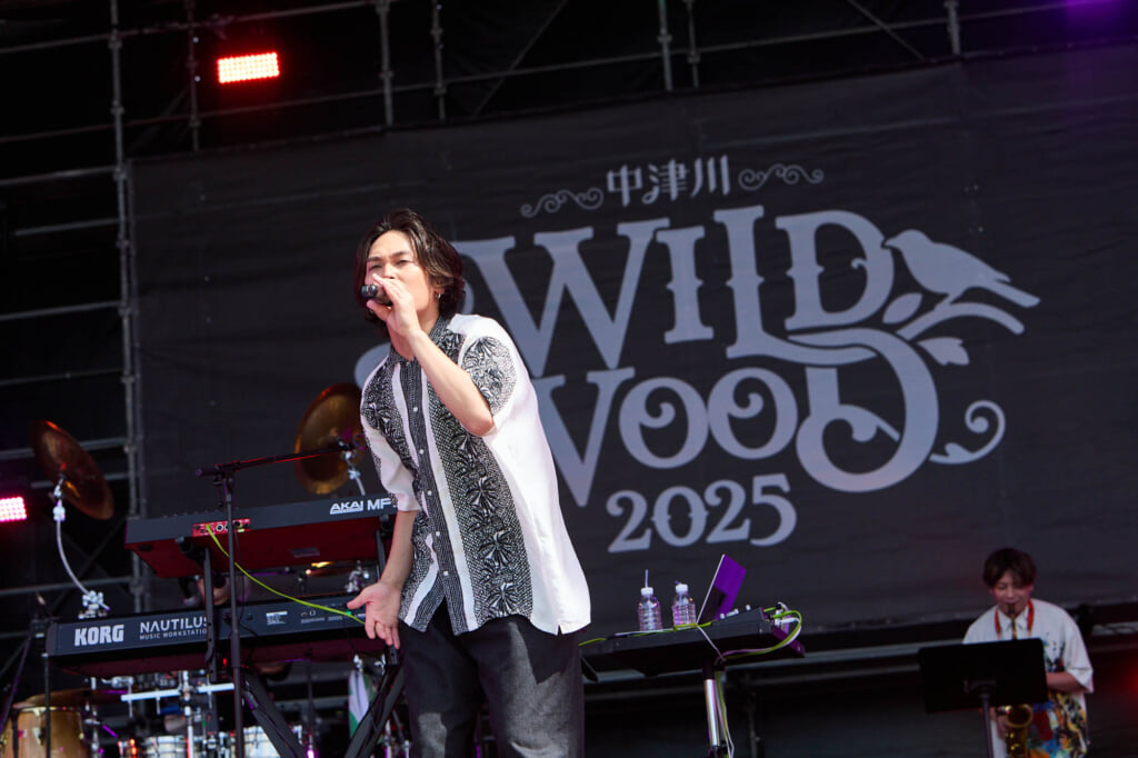 <中津川 WILD WOOD 2025>2日目。昨日は時々雨も降る曇り空だったが、本日は晴れ。フィールドの芝生や緑の木々が日差しを浴びて輝く中、Fools GOLDのトップバッターを務めたのはOmoinotakeだ。