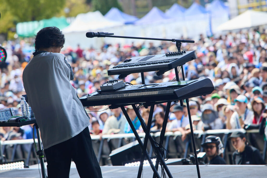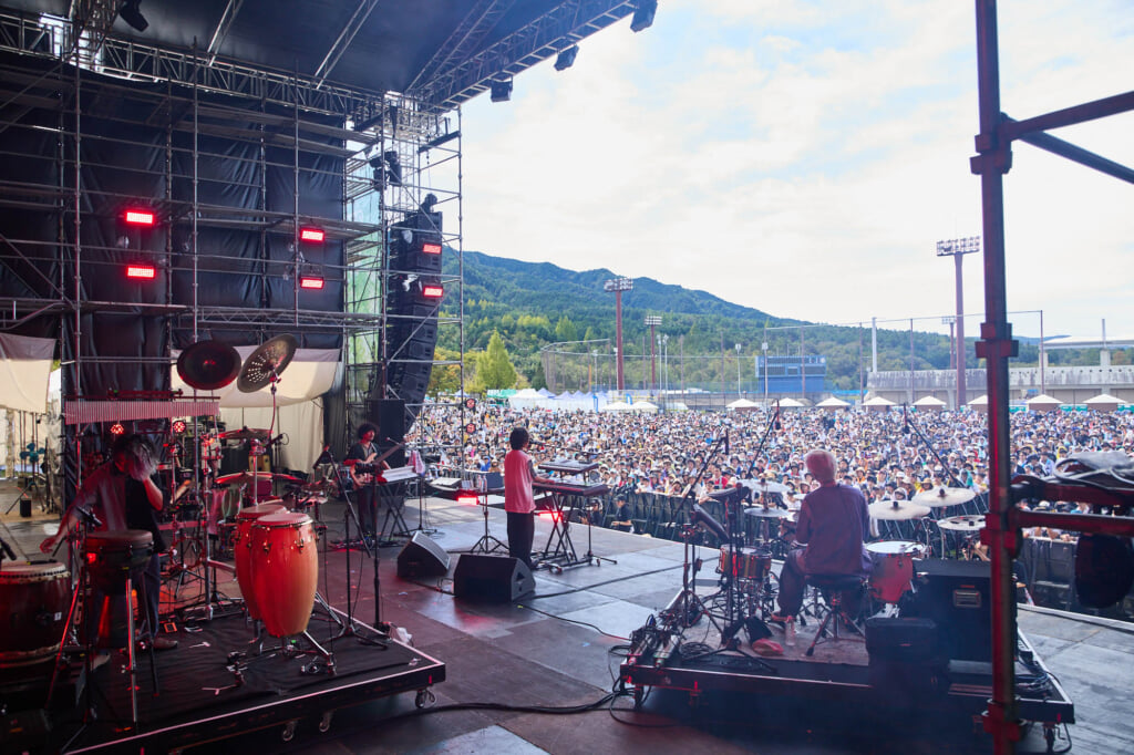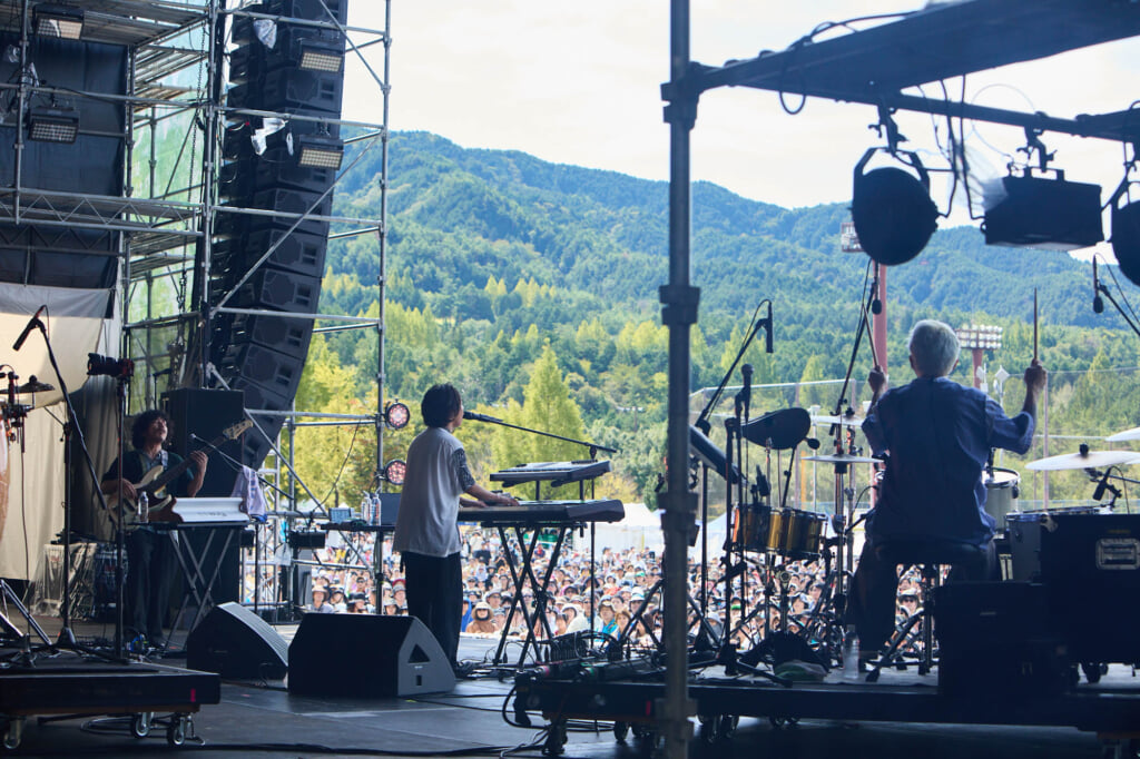 藤井の挨拶を挟み、さらに曲が披露された。観客の穏やかな手拍子によって温かく彩られた「心音」。身体をゆったりと揺らす人々を陽の光が照らす風景が平和そのものだった「幸せ」。そして「めちゃくちゃ空気が気持ちいいですね。次はゆったりした曲を届けたいと思います」と言い、鍵盤を弾きながら歌い始めた藤井。他のメンバーの演奏が合流した後、ドラマチックな展開を遂げた「ひとりごと」は、瑞々しいメロディでうっとりさせてくれた。