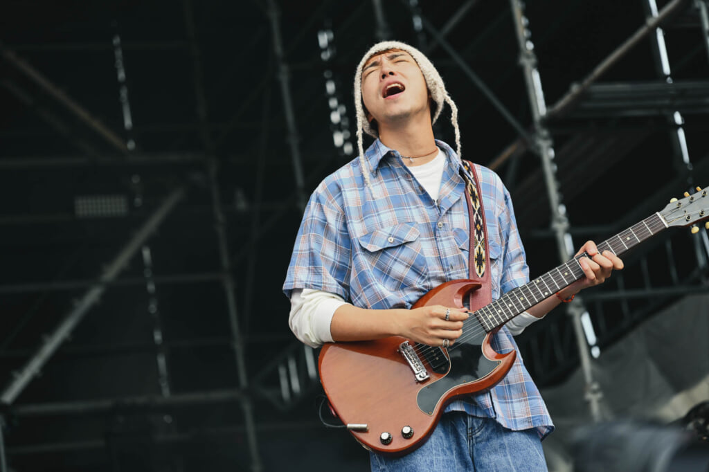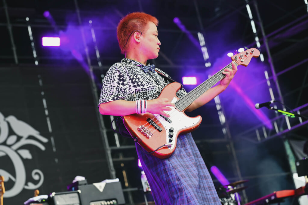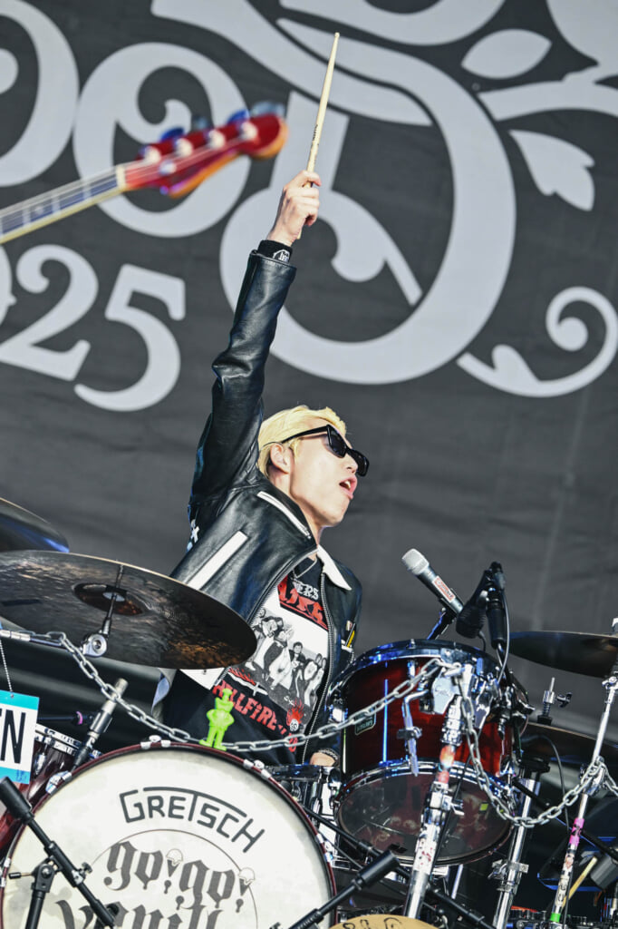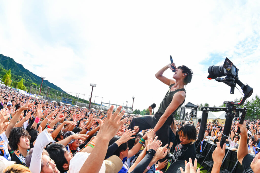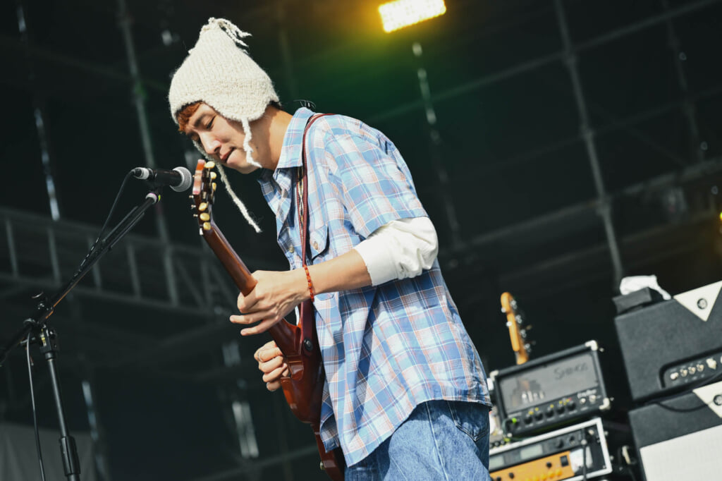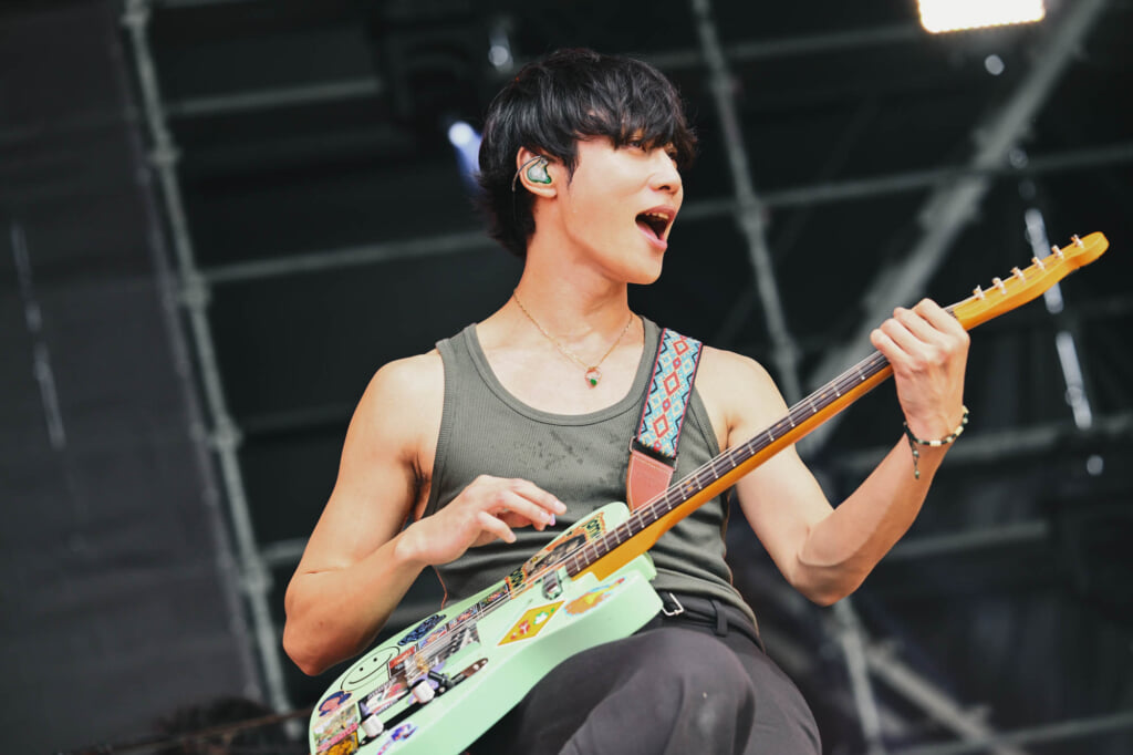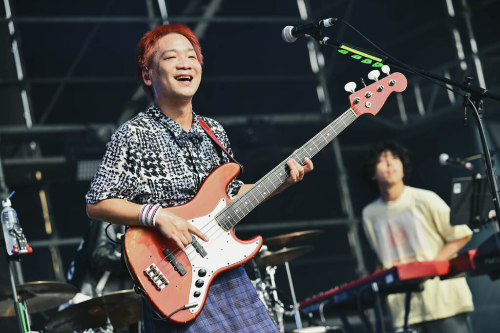 「中津川、楽しんでますか? いやあ~この場所、やっぱり最高やな! 僕たちがこの場所でライブをやったのは2019年がラストで、そのときはベースのプリティがお休みしていたんですけど、プリティ帰ってきた! 今日は思いっきり楽しみましょう!」と牧。「夏の新曲を」と紹介された曲は、TVアニメ『SAKAMOTO DAYS』第2クールエンディングテーマ曲「ダンデライオン」だ。柳沢が奏でる泣きのギターが導いて始まった憂いを帯びたメロディを、牧がスタンドマイクを両手で掴んで歌う。後半にハンドマイクに変えて片手を振りながら歌うと、オーディエンスも手を振って応える。切ない旋律ながらも、リズムに乗って気分が盛り上がる不思議なムードが午後の野外に絶妙に似合っていた。続く「SHAKE」では、マイナー調で激情的な歌とダンサブルな演奏が体を揺らしていく。