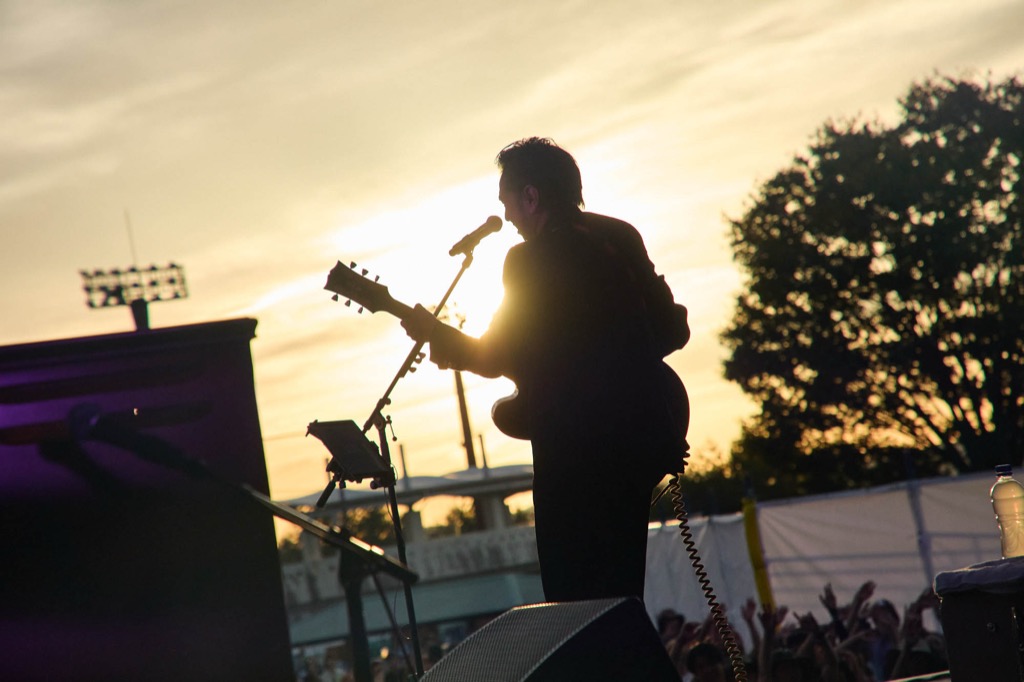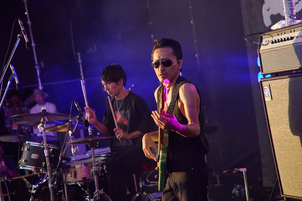 だいぶ涼しくなってきた17時過ぎ、WONDER WALLはOriginal Loveの出番を迎えた。田島貴男(Vo,G)が、サポートメンバーの小松秀行(Ba)、佐野康夫(Dr)、河合代介(Org)、木暮晋也(G,Cho)と共に大歓声で迎えられると、登場するなり「ヘイヘイヘイヘイ!」と叫んで、すぐさまギターを手に取りファンキーなリフを弾き始めた。オープニングに選ばれたのは、ライブ定番の「The Rover」だ。何の前置きもなく始まった、テンションの高い歌声とギターに圧倒される。間奏で木暮が耳をつんざく歪んだギターソロで前に出て煽ると、田島もソロを弾きながらギターを縦に掲げてチョーキングしてみせたり、ファルセットでシャウトして観衆の気持ちを高揚させる。