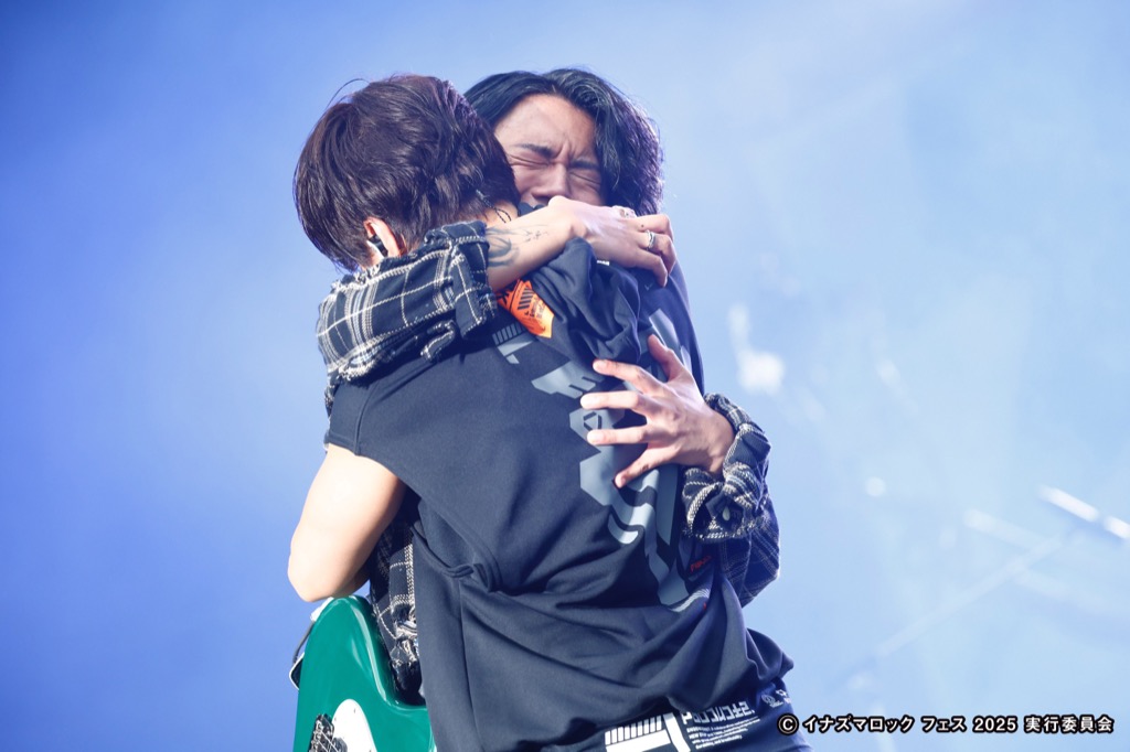 続いては、西川貴教のステージ。西川が登場すると、ひときわ大きな歓声が上がる。1曲目は「Never say Never」、イントロから客席は腕を掲げコールを送る。その客席の反応を見て、西川も思わず笑顔が溢れる。「会いたかったイナズマ!」と2曲目「BREACH」へ。西川はイナズマだけでなく、滋賀県でさまざまなアンバサダーも務めているが、その想いを「(イベントに)来てくれたり、つながってくれたりして、みんながこのイベントや滋賀県を一緒に愛してくれてる。今年は少し離れた大阪・関西万博で世界中の人がつながっているし、翌週には(滋賀で)「国スポ・障スポ」も開催されます。そういうイベントやスポーツ、いろんな経験を通じて得られるものを、(アンバサダーとして)世界に広げたい」と語り、まさにその想いに応えて、「このイベントから夢を叶えて、今や夢を与える人に成長したミュージシャン」として、Novelbrightのギター、沖聡次郎をステージに呼び込んだ。二人は固い握手を交わし、強くハグ。作詞を西川本人が、作曲を沖が手がけたナンバー「HEROES」を披露した。沖は15年前、15歳の時にイナズマで西川のステージを見て感銘を受け、「いつかミュージシャンになって、西川貴教と同じステージに立ちたい」という夢ができたという。その15年の想いがとうとう実現、この瞬間を目撃した会場の誰もが頬を涙で濡らした。