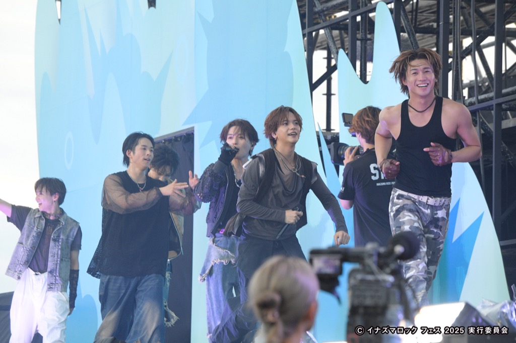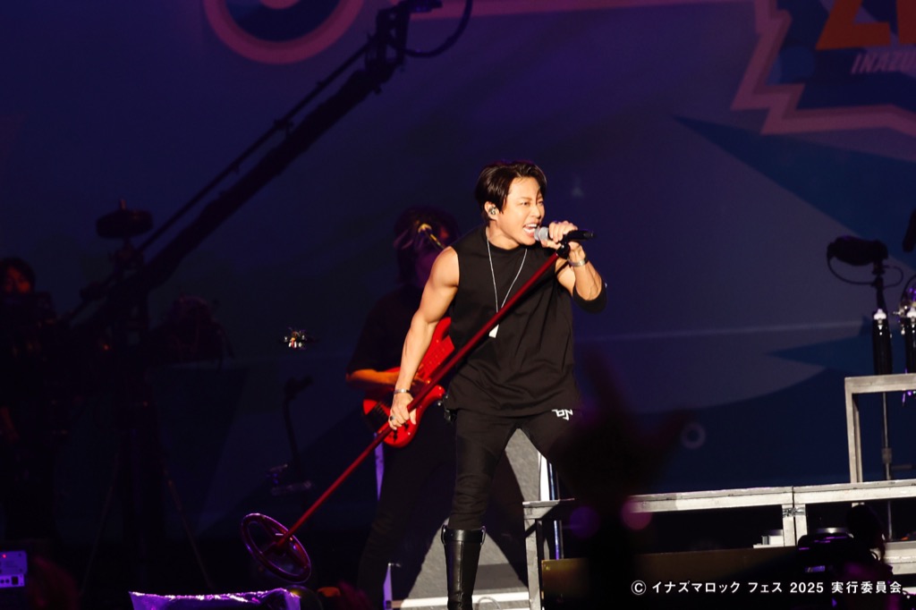 続いては、こちらもイナズマ初登場のYUTA (NCT) 。客席からキャーッという歓声が上がる中、「New World」でライブがスタート。サングラス姿のYUTAは、クールにロックチューンを歌い上げる。少しアップテンポの「Save You」に続き、「Possiboo-hoo」では「みんなで声出してください」と煽ると、客席からは「Oh-o-hooo」と大きな声が返ってくる。そして4曲目「When I’m Not Around」では、ギターを抱えた西川が登場! ギタープレイだけでなく、YUTA と顔を寄せて歌う場面もあって観客を沸かせる。会場には観客が振り回す色とりどりのタオルが蠢き、大いに盛り上がった。このあと10月から自身2度目となるソロツアー『YUTA LIVE TOUR 2025』が控えているYUTA、「日本でソロツアーが開催されるので、今日聞いて少しでも興味を持ってくださった方、よろしくお願いします!」を話したのち、「そろそろラストスパート!イナズマ Are you ready?」と、「Two Of Us」「Off The Mask」「BAD EUPHORIA」を立て続けにプレイ、全7曲をロックに歌い切った。
