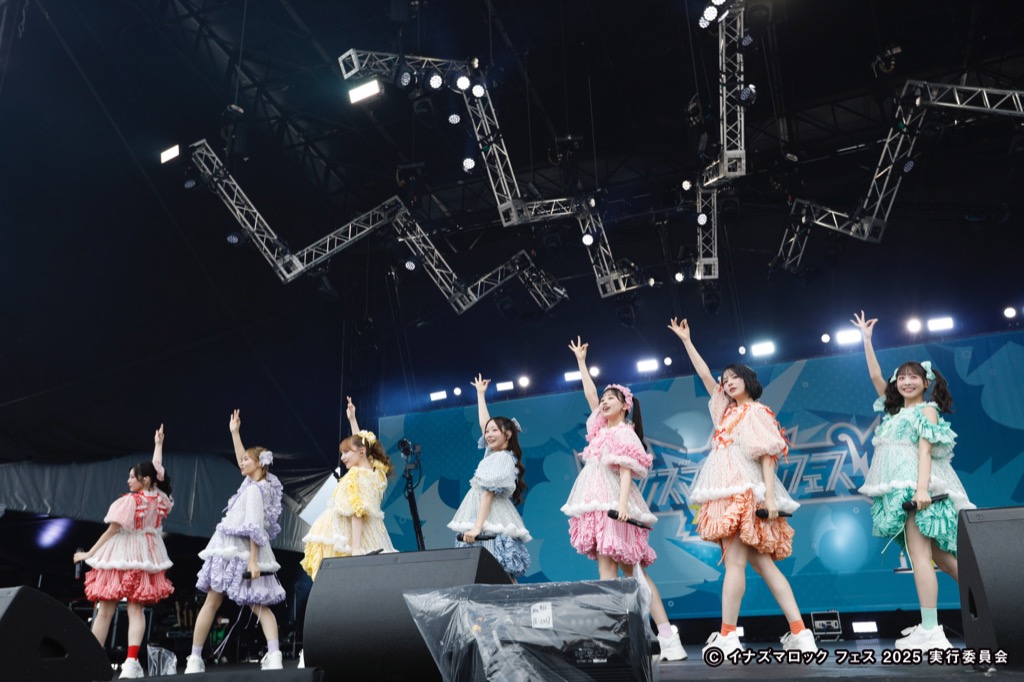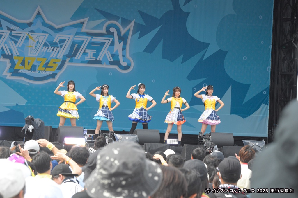 滋賀県初上陸、イナズマ初出演のFRUITS ZIPPERは、客席からの大きなコールにのって颯爽と登場。「イナズマロック盛り上がっていくぞー!」と「NEW KAWAII」でスタート。可愛い魅力を振りまきながら、客席をどんどん盛りあげる。カッコいい一面も見える「ふるっぱーりー!」のあとは、メンバーの自己紹介。「今日は初めて琵琶湖を見れてすごくテンション上がってるので、このままみんなとテンションぶち上げていきたい」と元気に盛り上げる。そして「滋賀県初上陸なので、私たちの代表曲でもあるこの曲をお届けできたら」と、「わたしの一番かわいいところ」をプレイ、観客も大いに沸いた。元気に飛び跳ねる「ぴゅあいんざわーるど」、「ピポパ」という言葉の響きが可愛い「ピポパポ」、そしてラストは「完璧主義で☆」。可愛いだけじゃない、パワフルなステージで観客を魅了した。